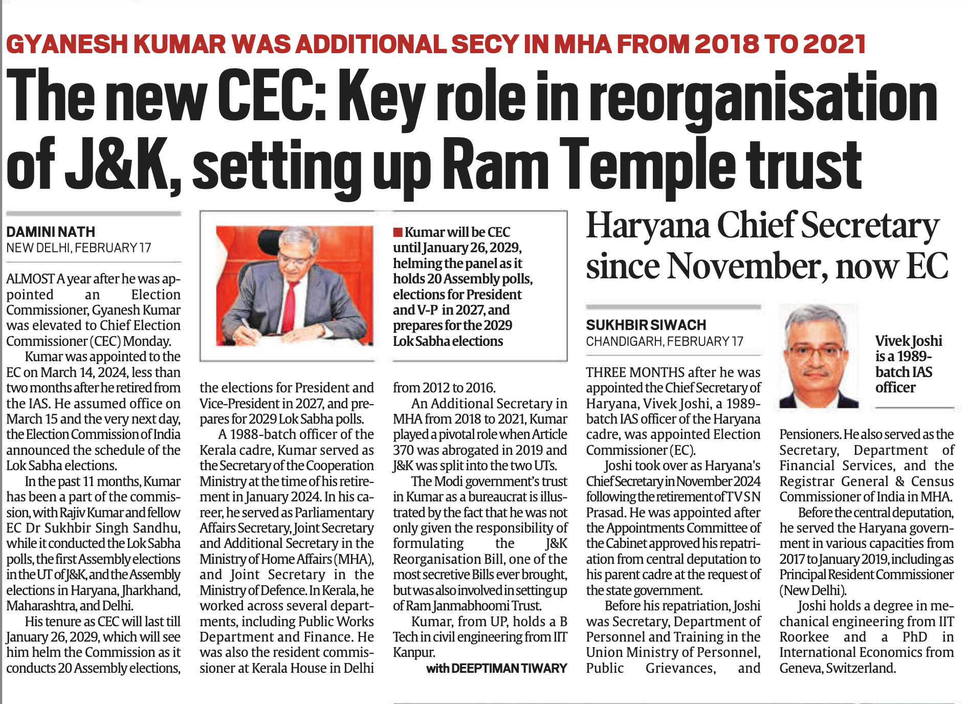 इंडियन एक्सप्रेस ने पहले पन्ने पर सीईसी की नियुक्ति व एलओपी राहुल गांधी की असहमति की खबर लगाई है। साथ ही, निवर्तमान सीईसी राजीव कुमार ने अपने विदाई भाषण में सुप्रीम कोर्ट से अनुरोध किया है कि चुनाव से जुड़ी याचिकाओं की सुनवाई के समय चुनाव की समय-सीमा का ध्यान रखा जाए। साथ ही, अखबार ने बताया है कि नए सीईसी ने महाराष्ट्र व केरल राज्य में अहम प्रशासनिक पदों पर काम किया है। इतना ही नहीं, मोदी सरकार के सबसे गोपनीय विधेयक ‘जम्मू-कश्मीर पुनर्गठन विधेयक’ को बनाने में भी उन्होंने अहम भूमिका निभाई थी और राम मंदिर ट्रस्ट निर्माण में भी उनकी अहम भूमिका थी। अखबार ने लिखा है कि 2024 में आईएएस से रिटायर होने के एक महीने बाद ही सरकार ने इन्हें चुनाव आयुक्त बना दिया और इसके ठीक एक दिन बाद ही लोकसभा चुनावों की घोषणा कर दी गई थी।