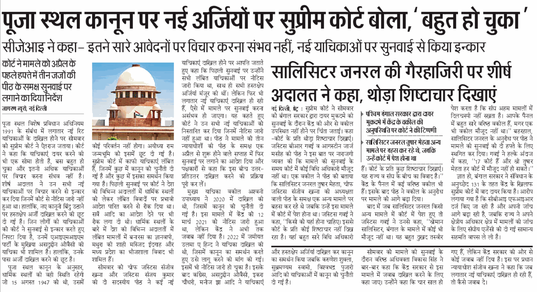 1991 के पूजा स्थल कानून को लागू करने की मांग वाली याचिकाओं की सुनवाई के दौरान सोमवार को सुप्रीम कोर्ट ने कहा कि इस मामले पर लगातार याचिकाएं दाखिल की जा रही हैं, इसकी भी एक सीमा होती है। सभी पर विचार करना संभव नहीं है इसलिए अब वह इस मामले पर और याचिकाएं स्वीकार नहीं करेगा। साथ ही दो जजों के ही मौजूद होने से इसकी सुनवाई टाल दी है। बता दें कि 6 धाराओं की वैधता पर दाखिल याचिकाओं पर चीफ जस्टिस संजीव खन्ना, जस्टिस पीवी संजय कुमार और जस्टिस मनमोहन की बेंच ने आखिरी बार 12 दिसंबर 2024 को सुनवाई की थी।