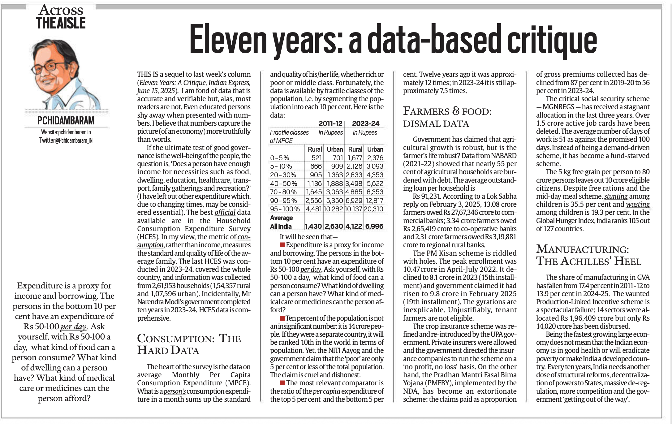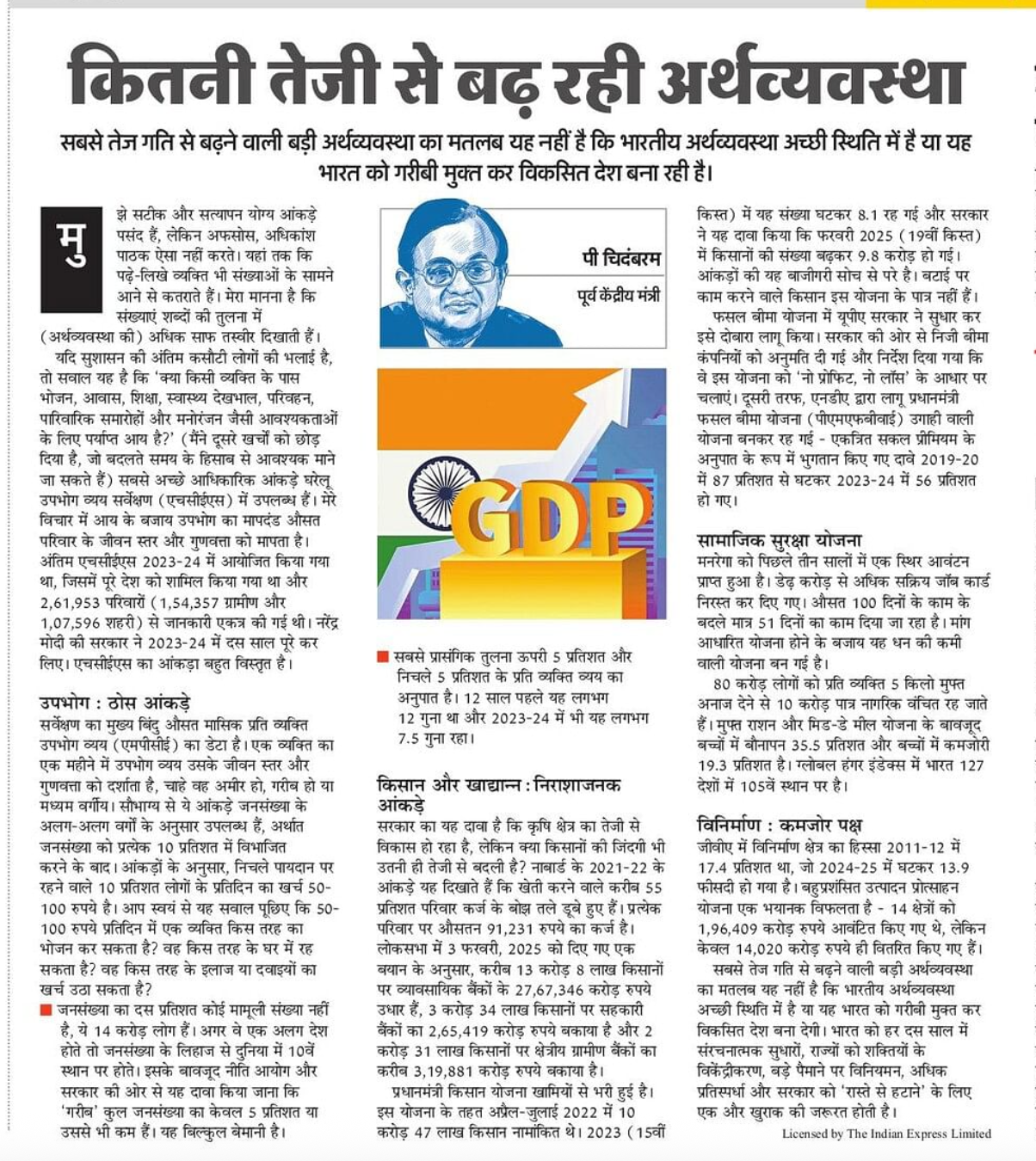 अपने लेख में चिदंबरम ने सरकार के कृषि विकास के दावों पर सवाल उठाया है। NABARD (2021-22) के आंकड़ों का हवाला देते हुए उन्होंने लिखा कि देश में 55% कृषि परिवार कर्ज में डूबे हैं, जिनका औसत ऋण 91,231 रुपये है। उन्होंने सरकार की ओर से लोकसभा में 3 फरवरी 2025 को दिए गए एक प्रश्न के जवाब का हवाला देते हुए लिखा कि सरकार के मुताबिक़, 13.08 करोड़ किसानों पर बैंकों का 27.67 लाख करोड़ रुपये बकाया है। यह आंकड़ा भारतीय किसानों की गंभीर वित्तीय संकट को दर्शाता है, क्योंकि यह राशि उनके आय स्तर और चुकाने की क्षमता से कहीं अधिक है।