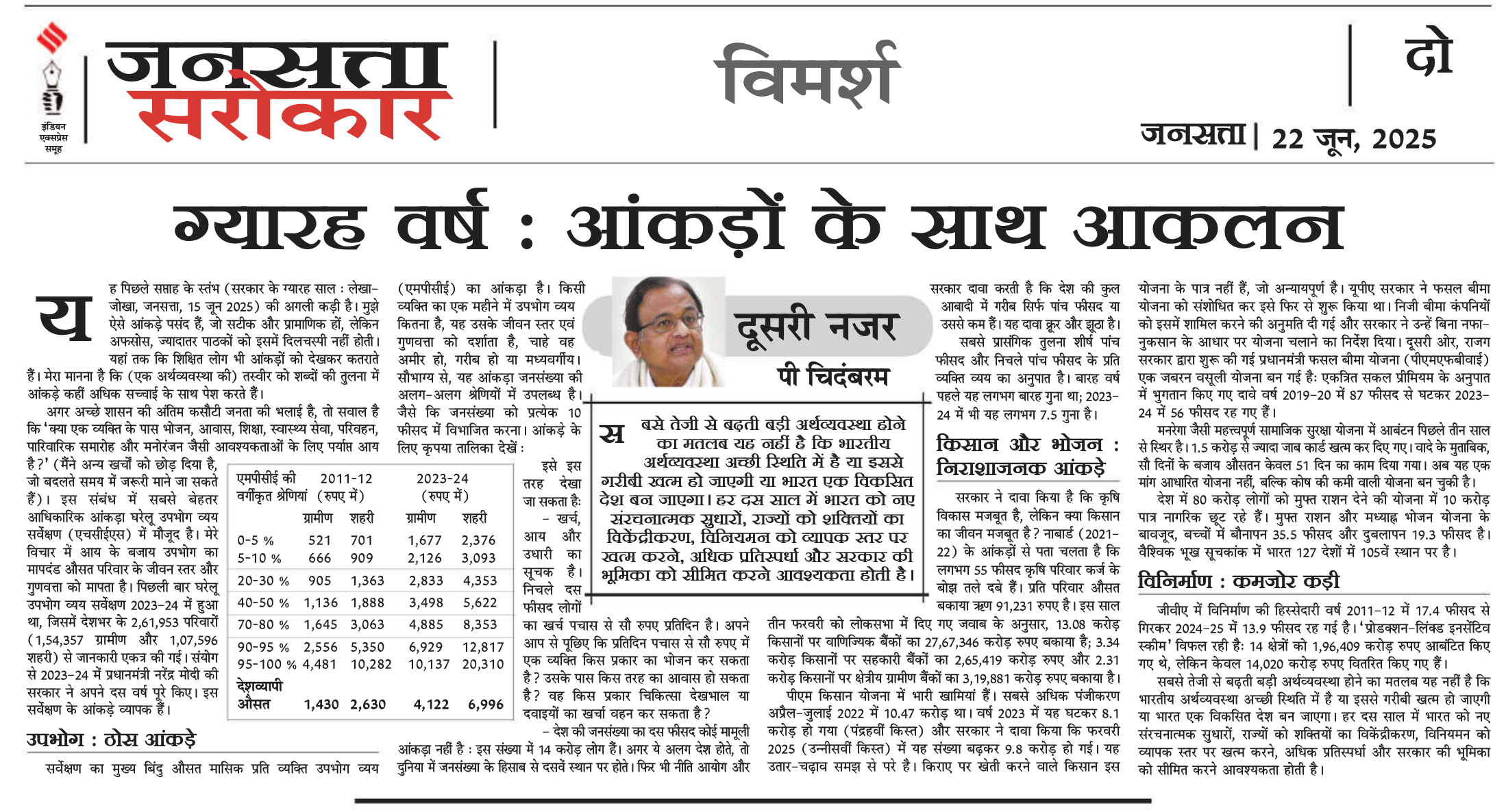 पूर्व वित्त मंत्री पी. चिदंबरम ने सरकारी आंकड़ों के आधार पर दावा किया है कि देश के सबसे ग़रीब दस प्रतिशत यानी क़रीब 14 करोड़ लोग हर दिन 50 से 100 रुपये में गुजारा करने को मजबूर हैं। चिदंबरम ने 22 जून 2025 को ‘द इंडियन एक्सप्रेस’ में अपने साप्ताहिक कॉलम “Eleven Years: A Data-Based Critique” में ऐसा लिखा है।