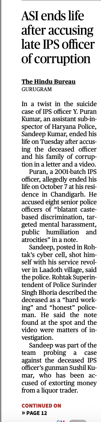 हरियाणा पुलिस में ADGP वाई पूरन सिंह की मौत के मामले में DGP समेत आठ बड़े पुलिस अफसरों के ऊपर जातिगत प्रताड़ना के आरोपों में केस दर्ज हुआ है। इस मामले ने 14 अक्तूबर को नाटकीय मोड़ ले लिया क्योंकि एक ASI ने कथिततौर पर आत्महत्या कर ली और मरने से पहले रिकॉर्ड करके एक वीडियो पुलिस व्हाट्सऐप ग्रुप में डाला। इस वीडियो में ADGP वाई पूरन सिंह को करप्ट बताया गया और DGP को ईमानदार।