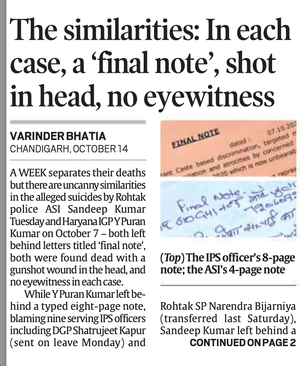 इंडियन एक्सप्रेस ने 15 अक्तूबर की कवरेज में ADGP और ASI की मौत के तरीकों में समानता पाई है। अखबार ने लिखा है कि दोनों की मौत सिर में गोली लगने से हुई, दोनों ही मामले में कोई Eye witness नहीं था। साथ ही, दोनों के ही कथित सुसाइड नोट के ऊपर अंग्रेजी में ‘Final Note’ लिखा हुआ है। जबकि ADGP ने सुसाइड नोट अंग्रेजी में टाइप किया था, ASI ने हाथ से हिन्दी में लिखा है।