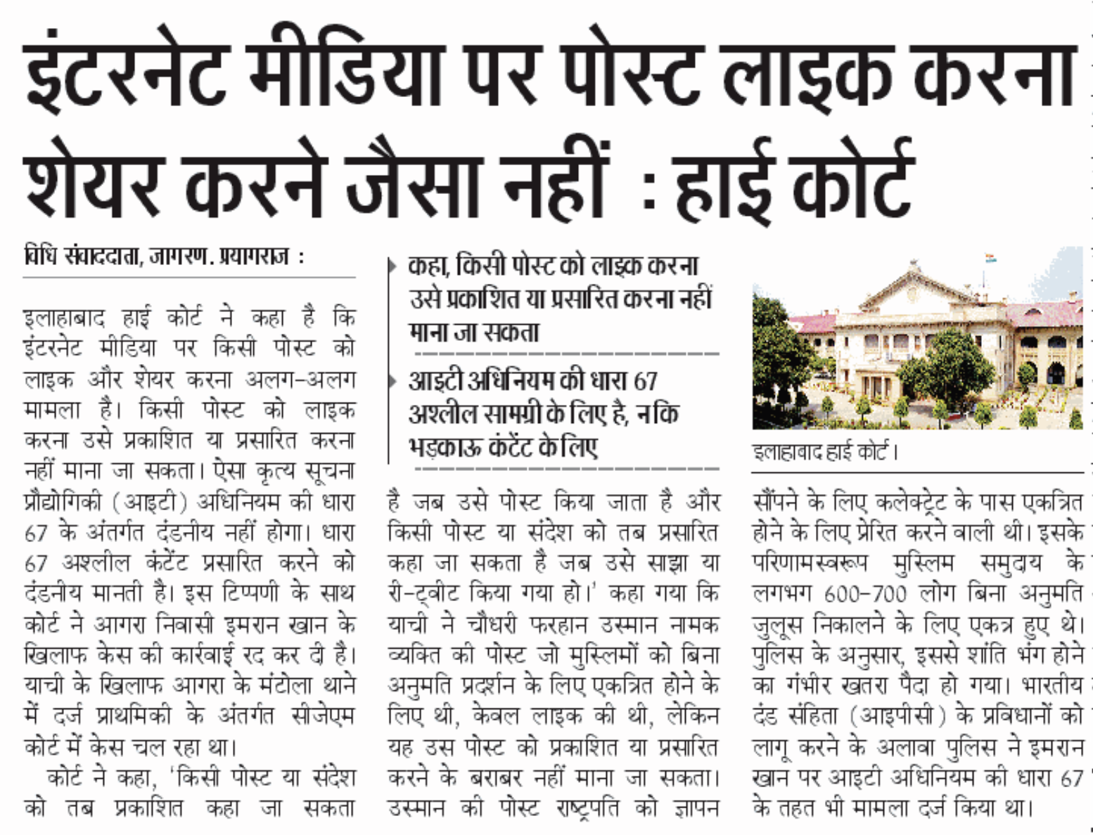 दैनिक जागरण के 20 अप्रैल के संस्करण में छपी ख़बर के मुताबिक़, उत्तरप्रदेश की इलाहाबाद हाईकोर्ट ने कहा कि किसी मामले पर पोस्ट करना उसे प्रकाशित करना है, जबकि उसी पोस्ट को शेयर या रीट्वीट करना उसे प्रसारित करना माना जाएगा। लाइक करना इससे अलग है। इस टिप्पणी के साथ अदालत ने आगरा निवासी इमरान खान के ख़िलाफ़ आईटी की धारा 67 के तहत दर्ज केस की कार्रवाई रद्द कर दी है। इमरान ने मुस्लिमों को बिना अनुमति प्रदर्शन करने के लिए इकट्ठा होने की अपील वाले एक पोस्ट को लाइक किया था, जिसके बाद उनके ख़िलाफ़ स्थानीय प्रशासन ने आईटी एक्ट में केस दर्ज कर दिया था।