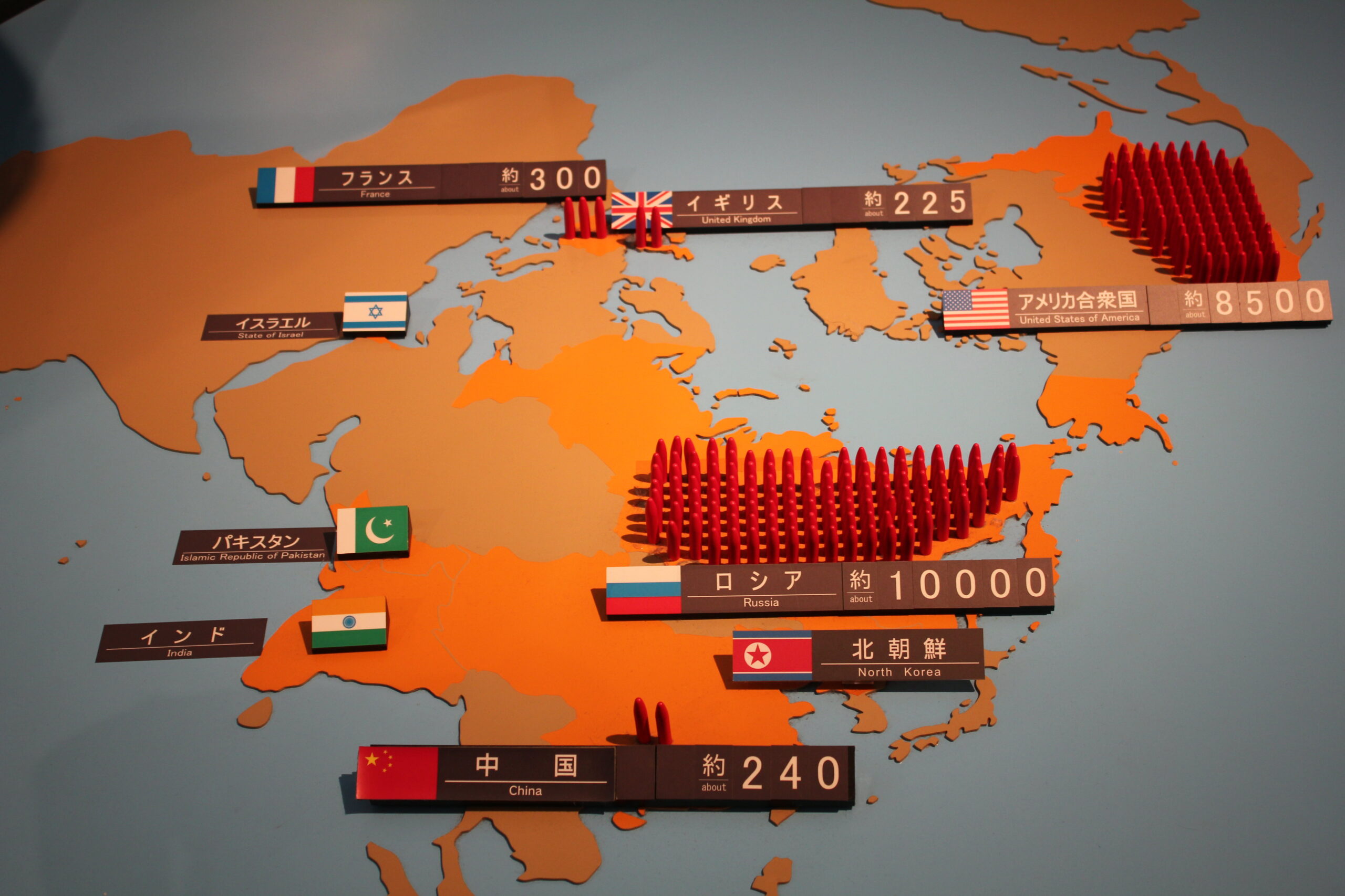 नागासाकी के ए-बॉम्ब म्यूजियम में रखा यह प्रदर्शन दिखाता है कि आज दुनिया में कितने परमाणु हथियार बचे हैं। (तस्वीर 2012, Credit: Tim Wright/ICAN via flickr)