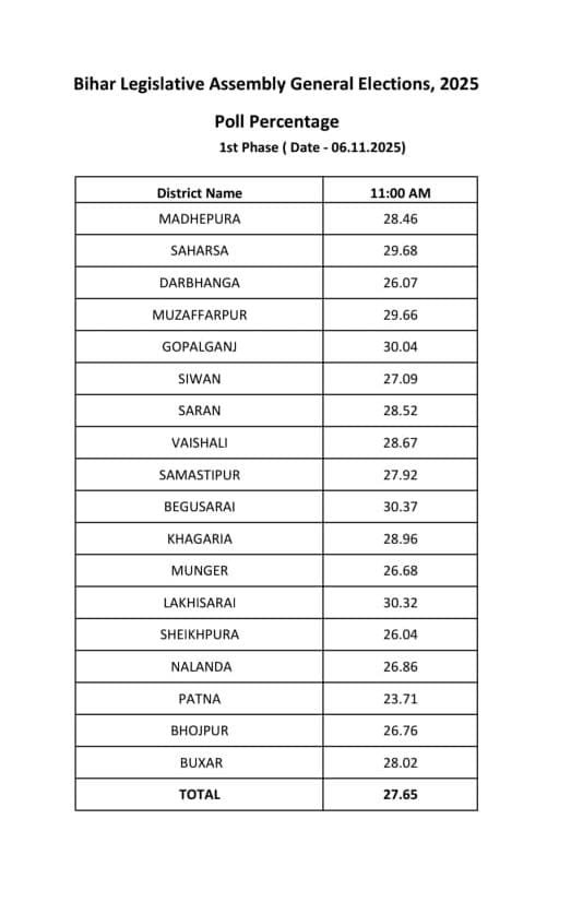 सुबह 11 बजे तक 27.65% वोटिंग हुई, पटना में कम वोटर निकले