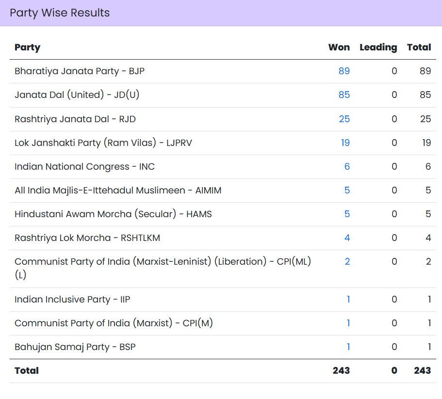BJP ने 89 सीटें जीती हैं, पिछली बार उसे 74 सीटें मिली थीं। 85 सीटों के साथ जदयू दूसरे नंबर पर रही, 2020 में उसे 42 सीटे ही मिली थीं। 19 सीटें लाकर लोजपा (रामविलास) ने सबको चौंका दिया, पिछली बार यह 1 सीट जीत सकी थी।