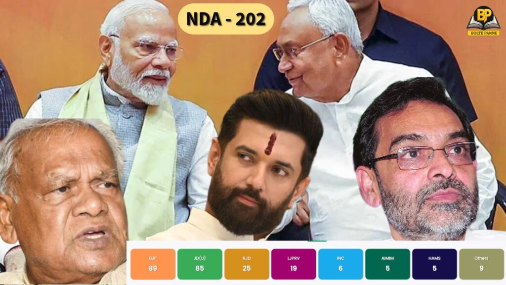 14 नवंबर की रात 11:30 बजे सभी चुनाव की काउंटिंग पूरी हो गई और फाइनल नतीजे जारी हो गए हैं। इसके मुताबिक, NDA 202 सीटें जीतकर बहुमत पा चुकी है।