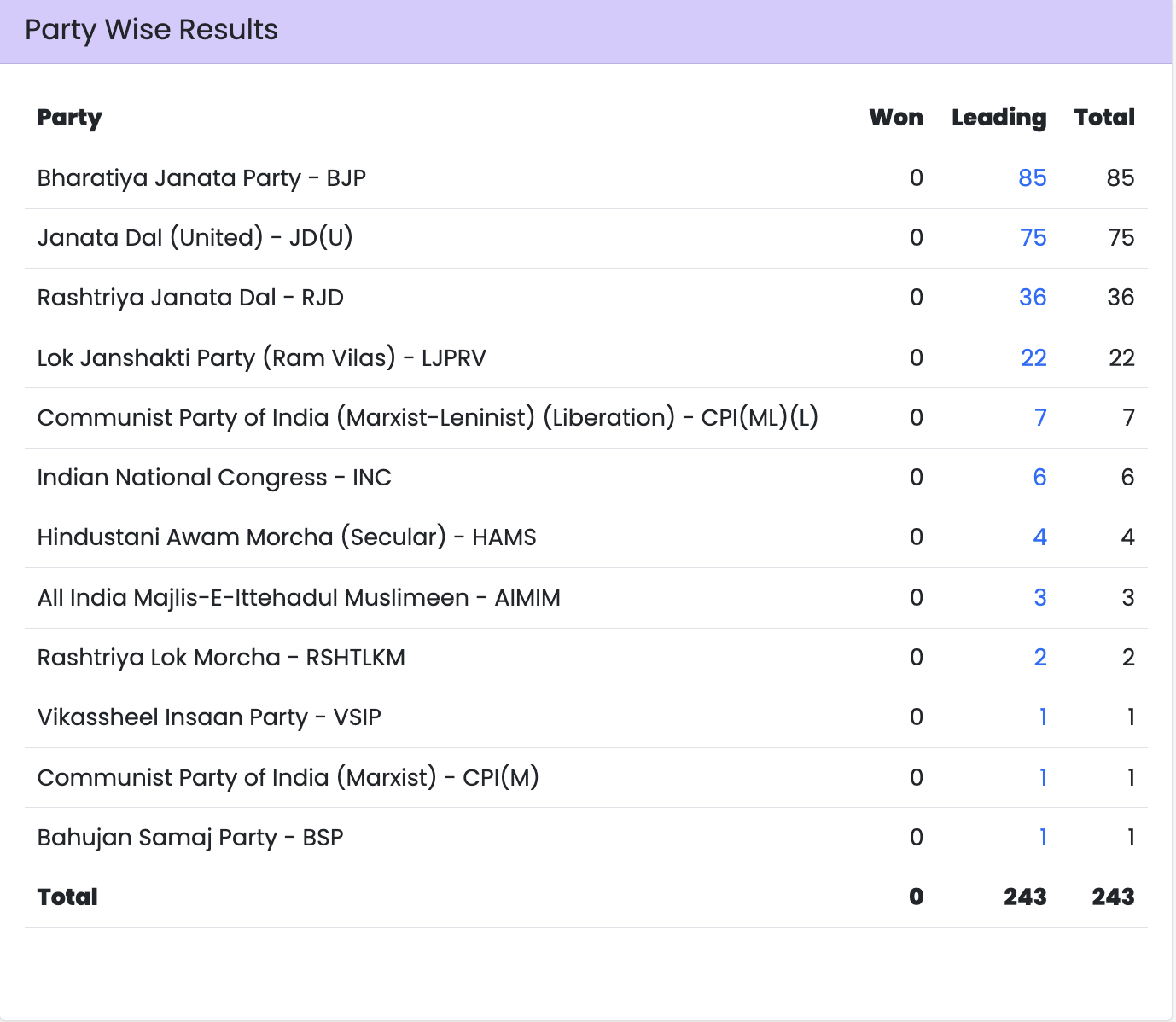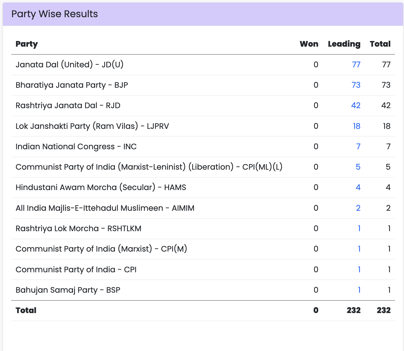 सुबह 10:30 बजे तक के डेटा के मुताबिक, NDA 173 सीटों पर आगे चल रही है, जबकि महागठबंधन 55 सीटों पर ही आगे है। सीटों के हिसाब से जदयू 77 सीटों पर आगे होकर सबसे बड़ी पार्टी दिख रही है, दूसरे नंबर पर 73 सीटों के साथ भाजपा और तीसरे नंबर पर 56 सीटों के साथ राजद है।