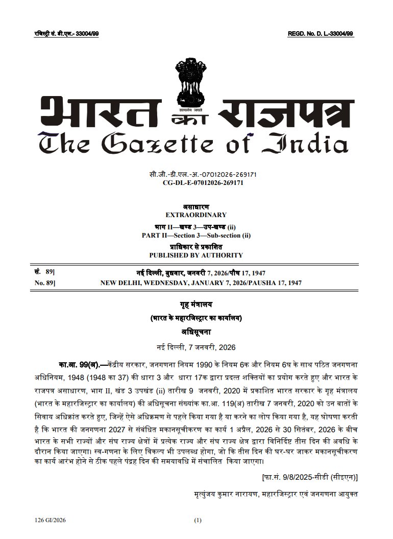 — Census India 2027 (@CensusIndia2027) January 7, 2026