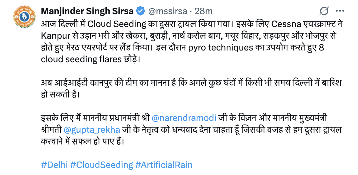 दिल्ली के पर्यावरण मंत्री मनजिंदर सिंह सिरसा ने एक्स पर लिखा कि ससेना एयरक्राफ्ट (Cessna) ने यूपी के कानपुर से उड़ान भरी। इसके मेरठ की ओर से दिल्ली मेें प्रवेश किया और यहां के बुराड़ी, नार्थ करोल बाग, मयूर विहार, सदकपुर और भोजपुर और बागपत के खेकरा में क्लाउड सीडिंग की गई। इसके बाद विमान मेरठ एयरपोर्ट पर लैंड हुआ। ये ट्रायल IIT कानपुर करा रहा है।