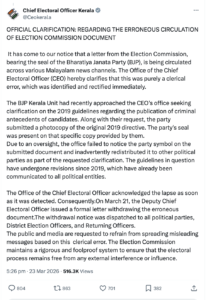 केरल के मुख्य निर्वाचन अधिकारी ने जारी स्पष्टीकरण में लिखा है कि “चुनाव आयोग के कार्यालय को यह जानकारी मिली है कि विभिन्न मलयालम न्यूज़ चैनलों पर भारतीय जनता पार्टी (भाजपा) की मुहर वाली एक पत्र का प्रसारण हो रहा है। मुख्य निर्वाचन अधिकारी (CEO) कार्यालय स्पष्ट करता है कि यह पूरी तरह से एक लिपिकीय त्रुटि (clerical error) थी, जिसकी पहचान होते ही उसे तुरंत सुधार लिया गया।”