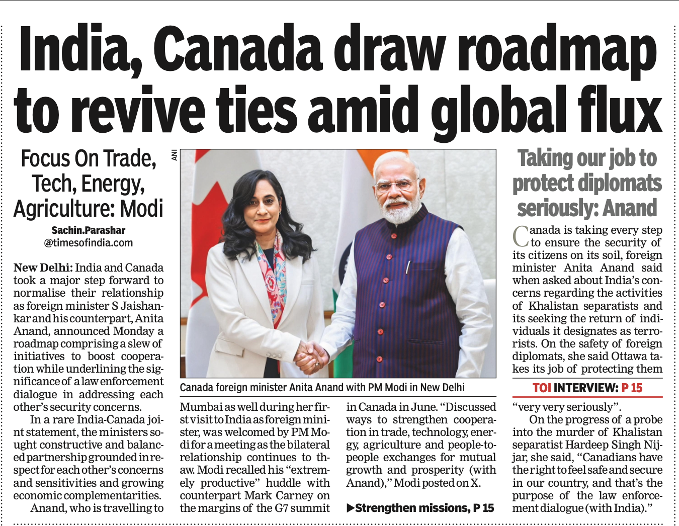 टाइम्स ऑफ इंडिया ने पहले पन्ने पर भारत-कनाडा व्यापार संबंध को लेकर खबर दी। दोनों देशों के बीच तल्खी के बाद कनाडा की विदेश मंत्री भारत दौरे पर आईं।
