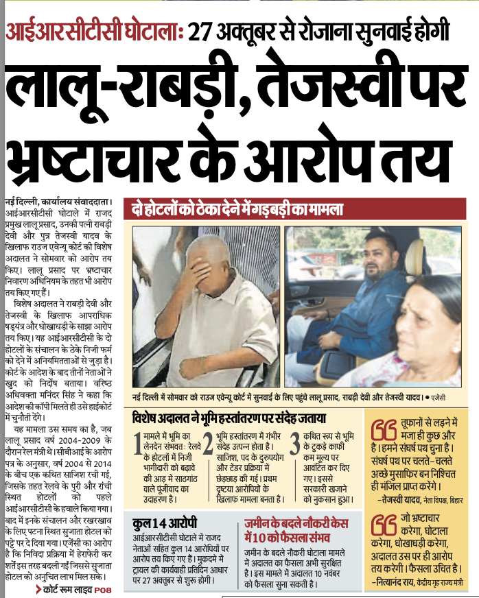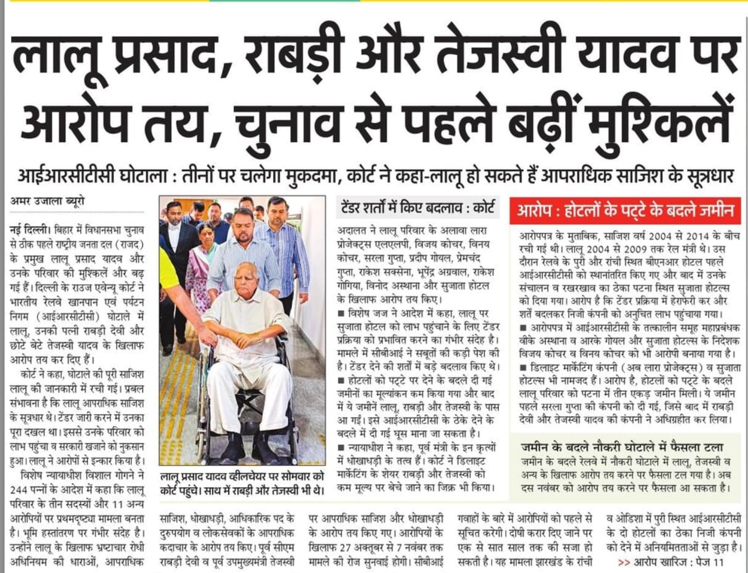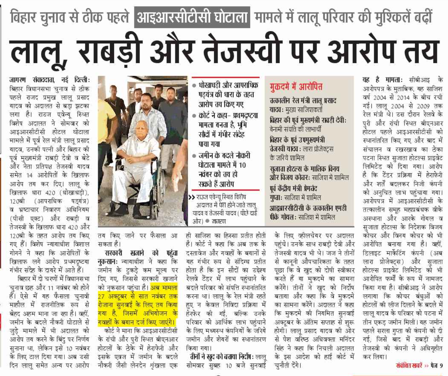 दैनिक जागरण ने लालू यादव के ऊपर land for jab घोटाले में आपराधिक आरोप तय होने की खबर को पहले पेज पर लिया।