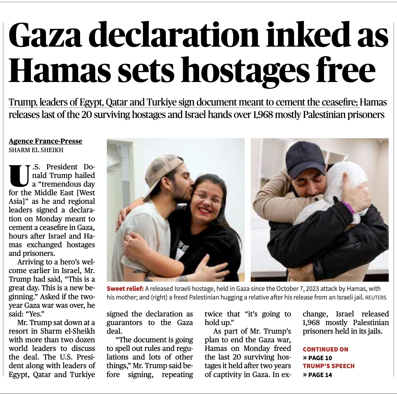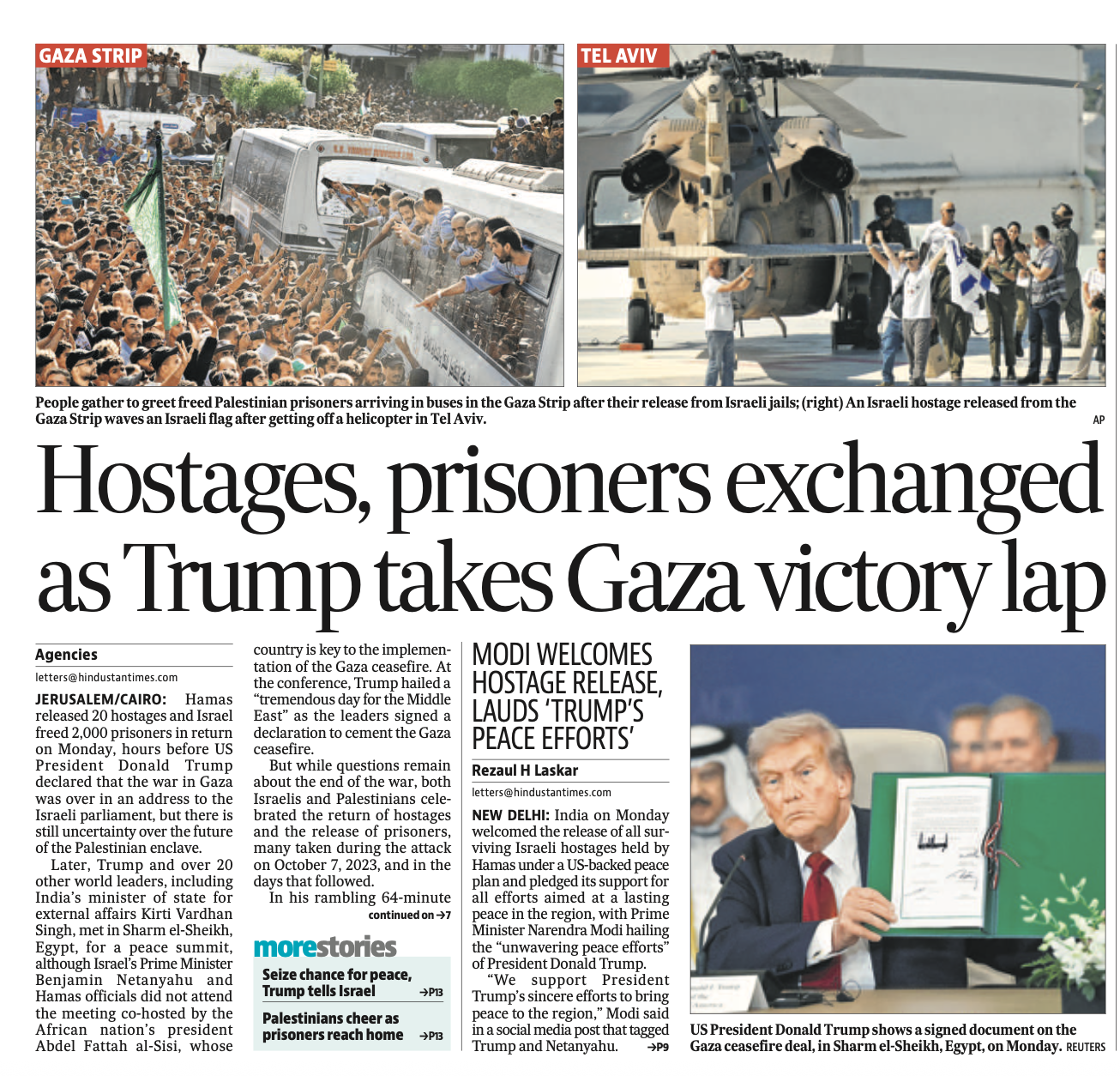 गज़ा में शांति की पहली शर्त यानी हमास की ओर से आखिरी जिंदा बीस बंधकों को इजरायल को सौंपना और बदले में फलस्तीनी बंधकों की वापसी की ऐतिहासिक घटना को सभी अंग्रेजी अखबारों ने पहली खबर बनाया। इसमें टाइम्स ऑफ इंडिया अपवाद था, जिसने इस खबर को फ्लैप पर जगह दी।
