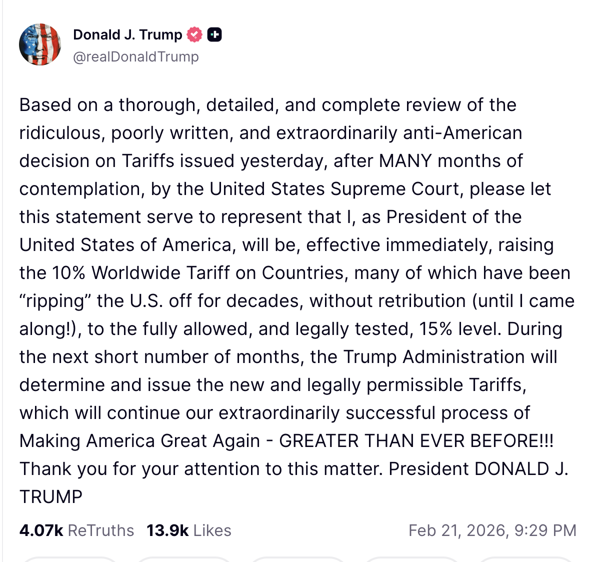 - 20 फरवरी को ट्रंप ने 10% वैश्विक टैरिफ की घोषणा की, जिसे एक दिन में ही बढ़ा दिया।