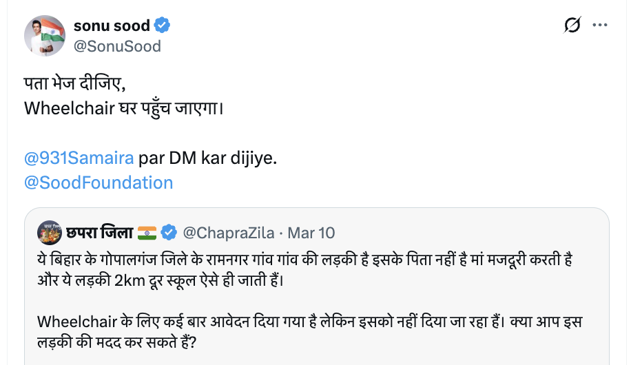 गोपालगंज की गरीब विकलांग छात्रा के दो किलोमीटर तक पैदल चलकर स्कूल जाने के संघर्ष को दिखलाते एक वीडियो के वायरल हो जाने के बाद उसकी जिंदगी बदल गई है। 15 साल की सोनी कुमारी की मदद के लिए अलीपुर विधानसभा की विधायक मैथिली ठाकुर सामने आईं। और उनकी पहल पर गोपालगंज जिला प्रशासन ने 12 मार्च को छात्रा को ट्राई साइकिल उपलब्ध करवाई है। इतना ही नहीं, विधायक व लोकगायिका मैथिली ठाकुर के अलावा, परोपकार के लिए प्रसिद्ध अभिनेता सोनू सूद और कवि व नेता कुमार विश्वास ने भी ट्वीट के जरिए इस छात्रा को मदद का आश्वासन दिया।
