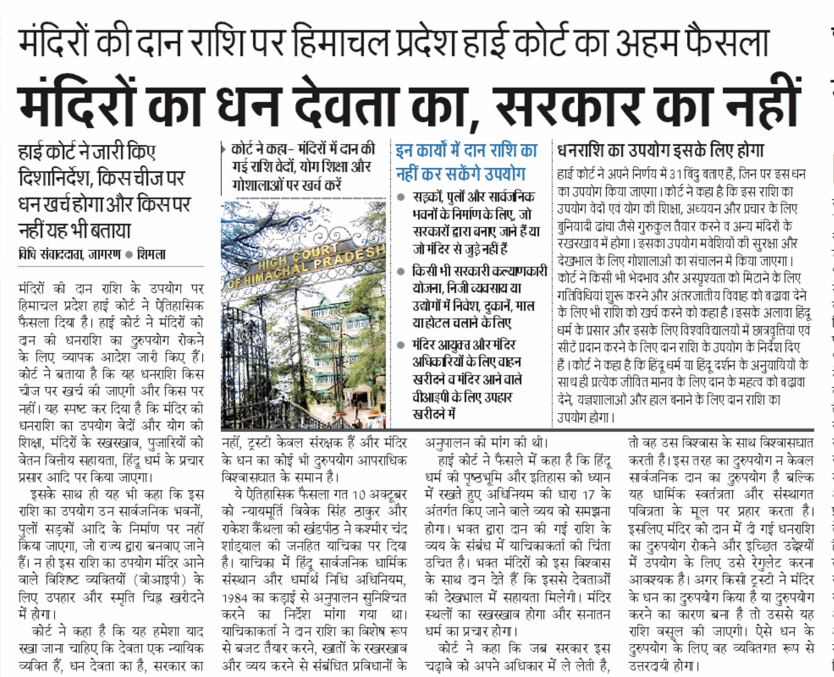 मंदिरों की दान धनराशि के दुरुपयोग से जुड़ा एक आदेश हिमाचल प्रदेश हाईकोर्ट ने जारी किया है, जिसको दैनिक जागरण ने पहली खबर बनाया।