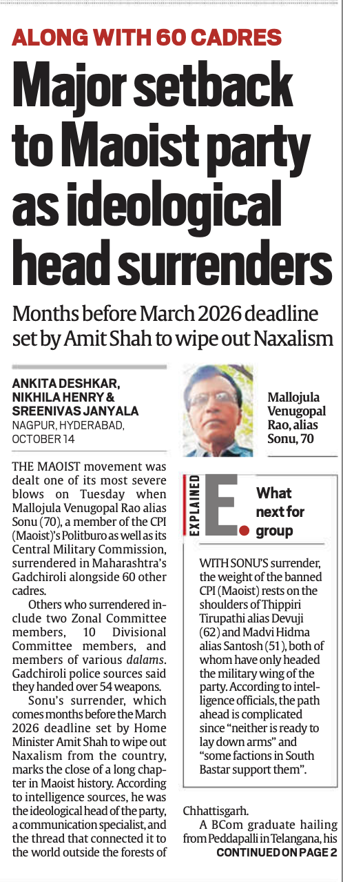 शीर्ष माओवादी कमांडर भूपति ने 60 अन्य नक्सलियों के साथ महाराष्ट्र के गड़चिरौली में सरेंडर कर दिया। इस खबर को माओवादी पार्टी के लिए एक बड़ा झटका और गृहमंत्रालय के लिए बड़ी सफलता बताते हुए इंडियन एक्सप्रेस ने पहली खबर बनाया है।