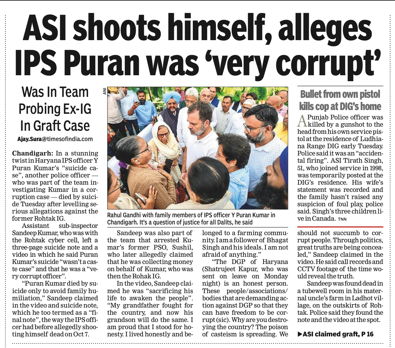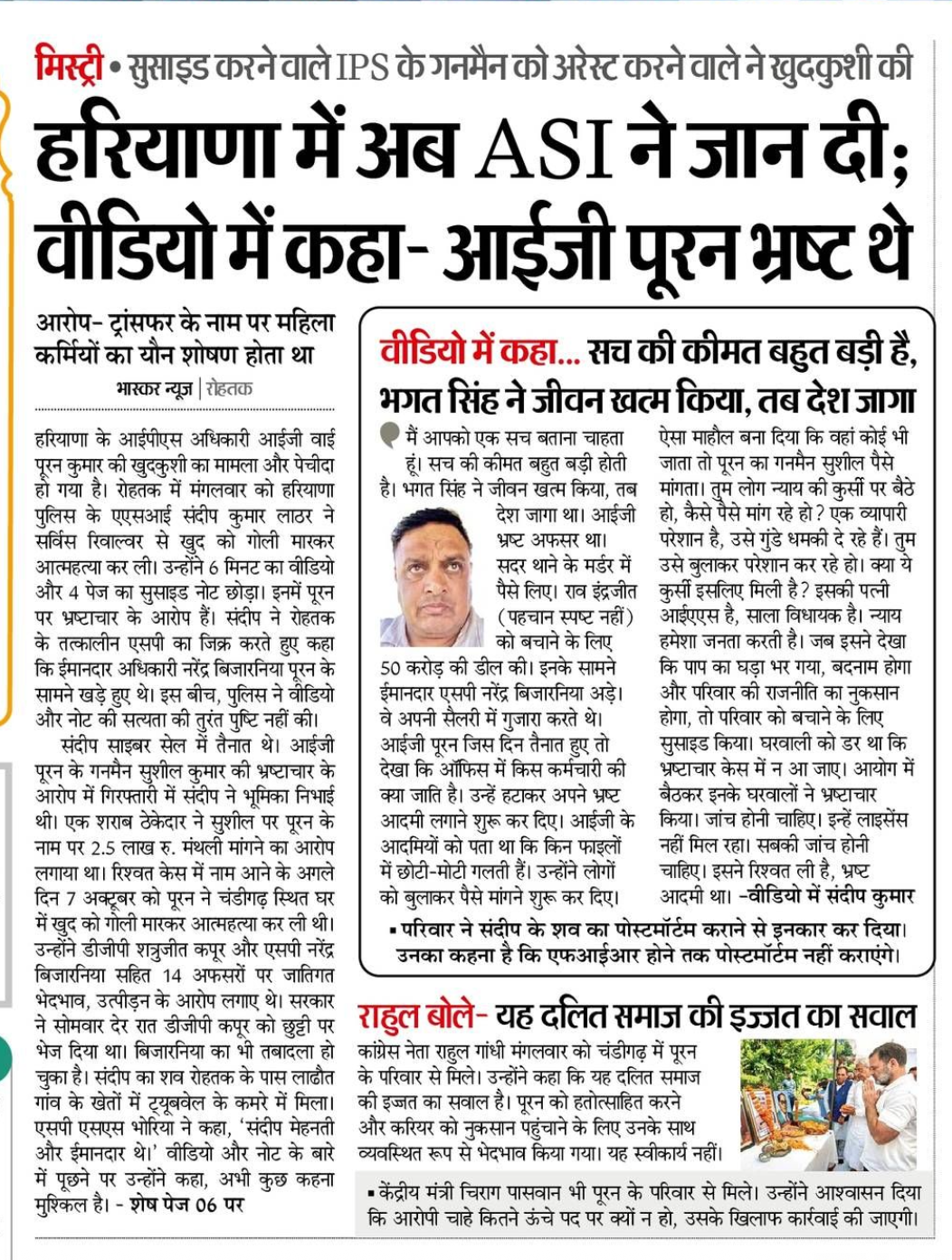 हरियाणा में ADGP पूरण कुमार की आत्महत्या के बाद अब एक ASI ने गोली मार सुसाइड कर लिया और उन्होंने मरने से पहले एक वीडियो बनाकर ADGP को भ्रष्ट भी बताया। इस खबर को अमर उजाला ने पहली खबर बनाया है।