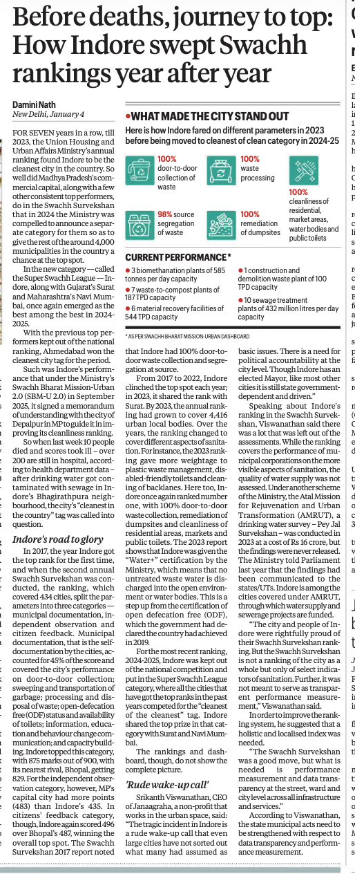 लंबे समय तक देश के सबसे स्वच्छ शहर का तमगा हासिल करने वाले इंदौर (MP) में पीने के दूषित पानी के चलते मचे हाहाकार के बाद इस शहर की रैंकिंग पर सवाल उठ रहे हैं। इंडियन एक्सप्रेस ने 5 जनवरी के संस्करण में इंदौर की सबसे स्वच्छ रैंकिंग को लेकर विस्तार से स्टोरी की है, जो पढ़ने योग्य है। बता दें कि पानी पीने के बाद यहां 10 से ज्यादा लोगों की मौत हो चुकी है और करीब 200 से ज्यादा लोगों की हालत ख़राब है, जिनका इलाज चल रहा है।