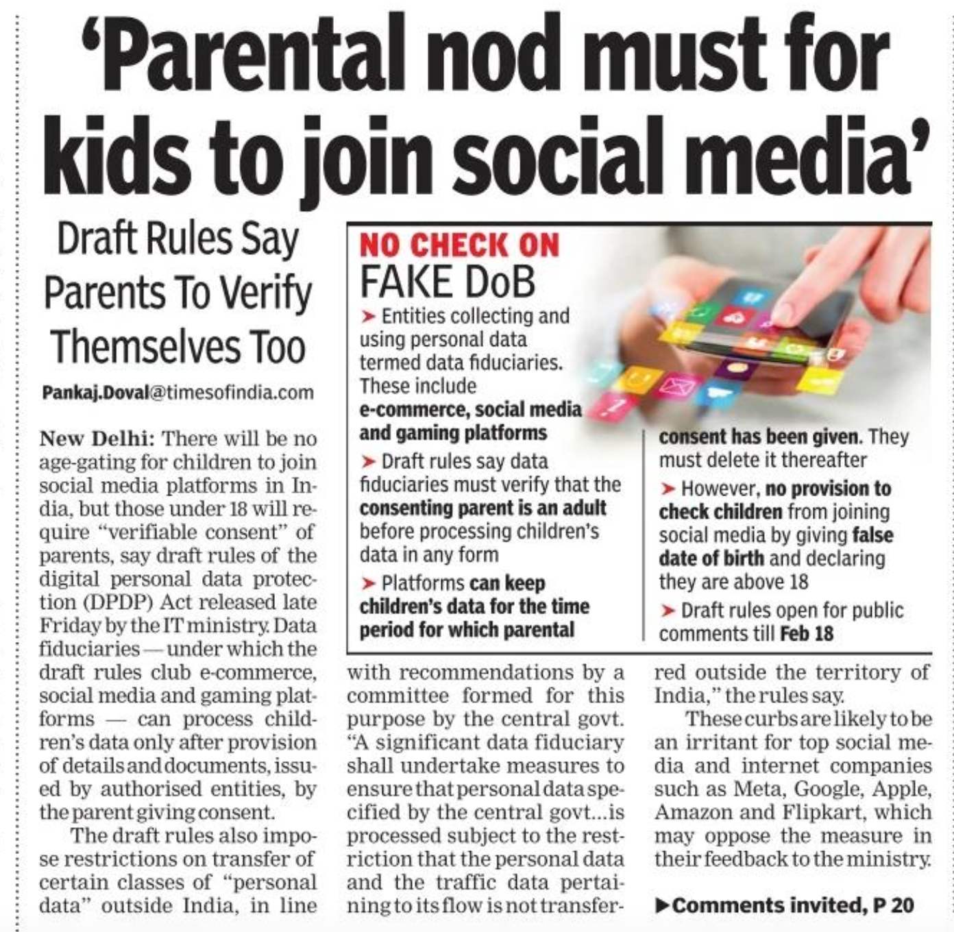 निजी डाटा सुरक्षा का मसौदा (डाफ्ट) शुक्रवार को केंद्र सरकार ने आम जनता की राय के लिए जारी कर दिया। कई अखबारों ने इस डॉफ्ट में निजी डेटा से जुड़े अलग-अलग नियमों पर खबर की है। द टाइम्स ऑफ इंडिया ने पहले पन्ने की लीड इसी खबर को बनाया है, हेडिंग है – अभिभावक की अनुमति से ही सोशल मीडिया पर आ सकेंगे बच्चे। खबर में बताया गया है कि भारत में बच्चों के लिए सोशल मीडिया ज्वाइन करना प्रतिबंधित नहीं होगा, हालांकि इससे जुड़ने के लिए उन्हें अपने अभिभावक की अनुमति चाहिए होगी जो कि वेरीफिकेशन प्रक्रिया वाली होगी। अखबार के मुताबिक, मसौदे के नियमों में कहीं ऐसा प्रावधान नहीं है कि किसी बच्चे को गलत जन्मतिथि बताकर सोशल मीडिया प्लेटफॉर्म पर जुड़ने से रोका जा सके।