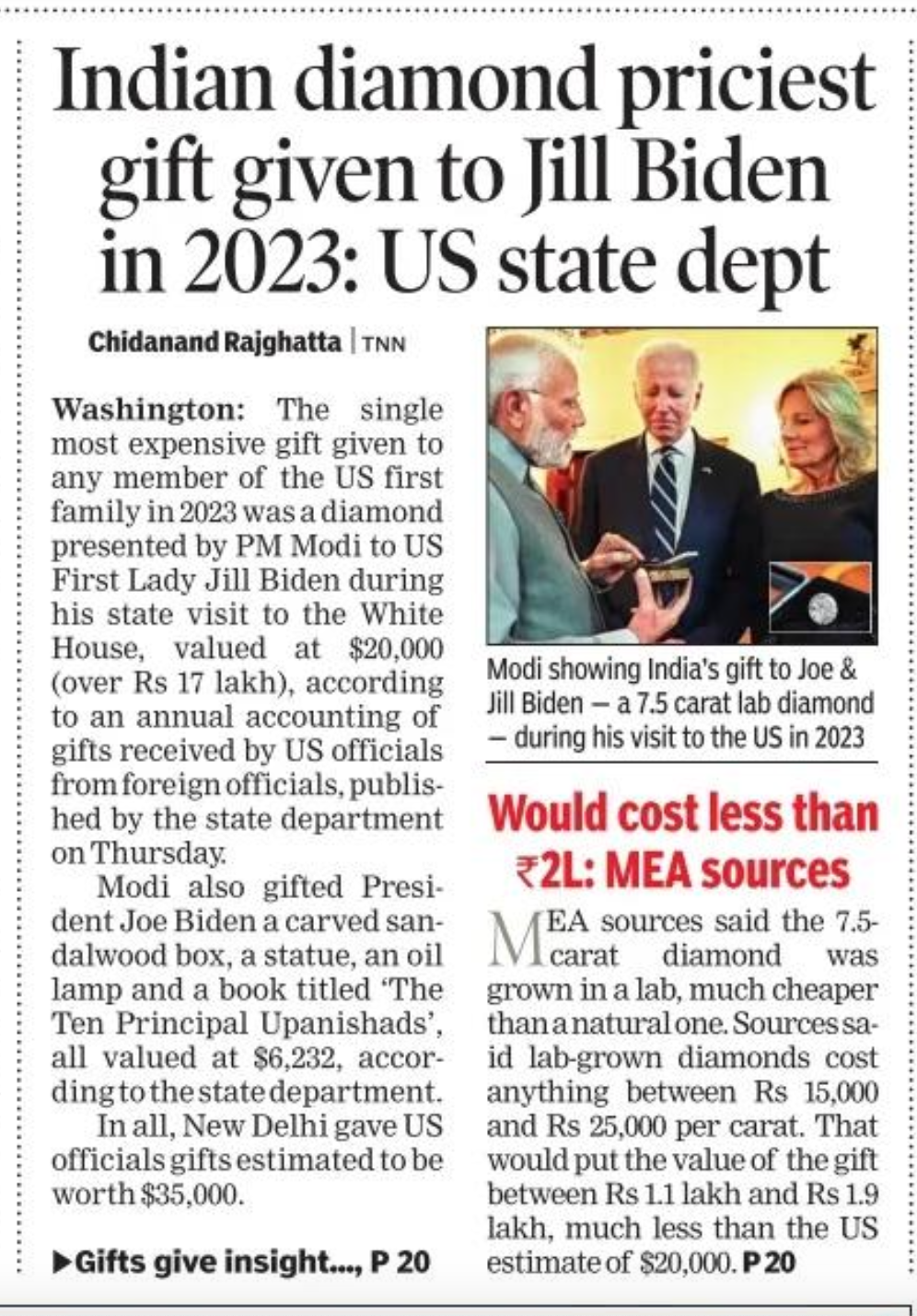 द टाइम्स ऑफ इंडिया ने पहले पन्ने पर खबर दी है कि प्रधानमंत्री नरेंद्र मोदी ने 2023 में अपनी अमेरिका यात्रा के दौरान राष्ट्रपति जो बाइडन की पत्नी जिल बाइडन को 7.5 कैरेट का एक हीरा तोहफे में दिया था, जिसकी भारतीय करेंसी में कीमत 17 लाख (20 हजार अमेरिकी डॉलर) है। यह तोहफा अमेरिकी के पहले परिवार के किसी भी सदस्य को साल 2023 में मिला सबसे महंगा तोहफा था
