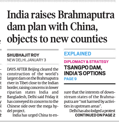 चीन ने लद्दाख के कुछ क्षेत्रों में अपनी दो नई काउंटी बनाई हैं, जिस पर कड़ी प्रतिक्रिया जताते हुए भारतीय विदेश मंत्रालय ने कहा कि अवैध कब्जा स्वीकार नहीं किया जाएगा। दरअसल चीनी मीडिया ने 27 दिसंबर को जानकारी दी है कि चीन के होटन प्रान्त में दो नई काउंटी बनाई गई हैं। इसके अलावा, भारत ने चीन की ओर से ब्रह्मपुत्र नदी पर बांध बनाए जाने के फैसले पर भी चिंता जताई है। भारतीय विदेश मंत्रालय ने इस संबंध में शुक्रवार को कहा कि नई दिल्ली ने तिब्बत में यारलुंग जांगबो नदी पर पनबिजली बांध बनाने की चीन की योजना के बारे में बीजिंग को अपनी चिंताएं बताई हैं। इस खबर को भी टाइम्स, एक्सप्रेस ने प्रमुखता से पहले पन्ने पर छापा है।
