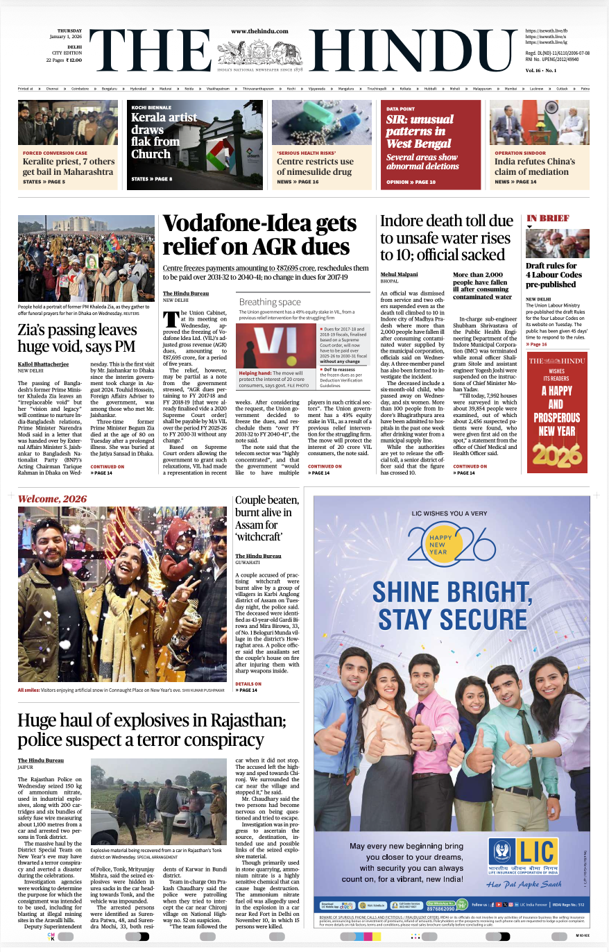 द हिन्दू के एक जनवरी 2026 के एडिशन में भी हार्ड खबरें प्राथमिकता से प्रकाशित हैं, हालांकि नए साल के जश्न का एक बड़ा फोटो लगाया है।