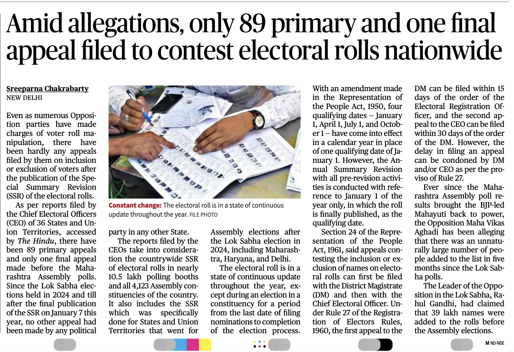 महाराष्ट्र विधानसभा चुनाव के दौरान विपक्षी राजनीतिक दलों ने आरोप लगाए थे कि बड़ी संख्या में मतदाता सूची में नाम जोड़ व घटा दिए गए। इस आरोप के बावजूद विशेष सारांश मतदाता सूची के प्रकाशन के बाद भी मतदाताओं को शामिल करने या बाहर करने के संबंध में राजनीतिक दलों की ओर से शायद ही कोई अपील दायर की गई है। द हिंदू ने 36 राज्यों और केंद्र शासित प्रदेशों के मुख्य चुनाव अधिकारियों (सीईओ) की ओर से दायर रिपोर्ट प्राप्त करके उसकी जाँच की गई है, जिसके मुताबिक– महाराष्ट्र विधानसभा चुनाव से पहले 89 प्राथमिक अपीलें और केवल एक अंतिम अपील की गई है। 2024 में हुए लोकसभा चुनावों से लेकर इस साल 7 जनवरी को मतदाता सूची के विशेष सारांश संशोधन (एसएसआर) के अंतिम प्रकाशन तक किसी भी अन्य राज्य में किसी भी राजनीतिक दल द्वारा कोई अन्य अपील नहीं की गई।