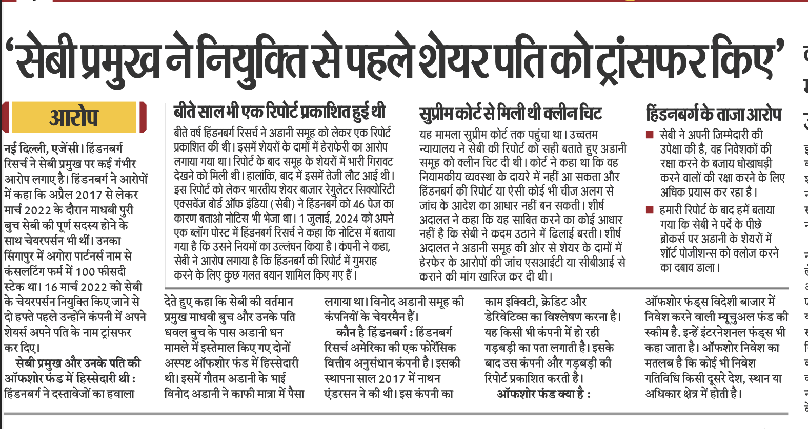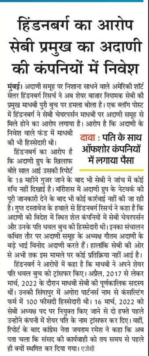 जागरण ने अंदर के पेज पर लगाई अपनी खबर में लिखा है कि सुप्रीम कोर्ट के आदेश का हवाला देते हुए हिंडनबर्ग ने कहा कि सेबी ने अपनी जांच में अदाणी के ऑफशोर शेयरधारकों के वित्तपोषण की कोई जानकारी नहीं दी है। अगर सेबी वास्तव में ऑफशोर फंडधारकों को ढूंढना चाहता था तो शायद अपने चेयरपर्सन से जांच शुरू कर सकता था। हिंडनबर्ग ने लिखा है कि हमें इसमें कोई आश्चर्य नहीं है कि सेबी ऐसी जांच करने में अनिच्छुक था जो उसे अपने चेयरपर्सन तक ले जा सकता था। इस खबर की शुरुआत में जागरण ने लिखा है कि हिंडनबर्ग की पहली रिपोर्ट को जांच के आधार पर सुप्रीम कोर्ट खारिज कर चुका है।