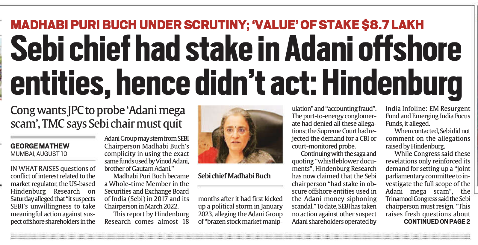 अंग्रेजी के एक अन्य प्रमुख अखबार द टाइम्स ऑफ इंडिया (TOI) ने इसे पहले पन्ने पर दूसरी बड़ी स्टोरी बनाया है, जिसमें हिंडनबर्ग रिपोर्ट के हवाले से बताया गया है कि सेबी प्रमुख बनने से पहले बच व उनके पति के अदाणी कंपनी में स्टेक थे। सेबी चेयरपर्सन बनने के दो सप्ताह पहले माधवी पुरी बुच ने ये हिस्सेदारी अपने पति धवल बुच को स्थानांतरित कर दी थी। हालांकि सेबी में बुच होलटाइम मेंबर के तौर पर 2017 से ही जुड़ी हुई थीं। TOI ने लिखा कि शनिवार देर शाम जारी की गई इस रिपोर्टर पर बुच दंपति ने रात डेढ़ बजे एक्स पर बयान जारी करके आरोपों को निराधार बताया और कहा कि उनका वित्तीय लेनदेन एक खुली किताब है। द हिन्दू ने भी टाइम्स ऑफ इंडिया की तरह इस खबर को पहले पन्ने की दूसरी मेन स्टोरी बनाया है।