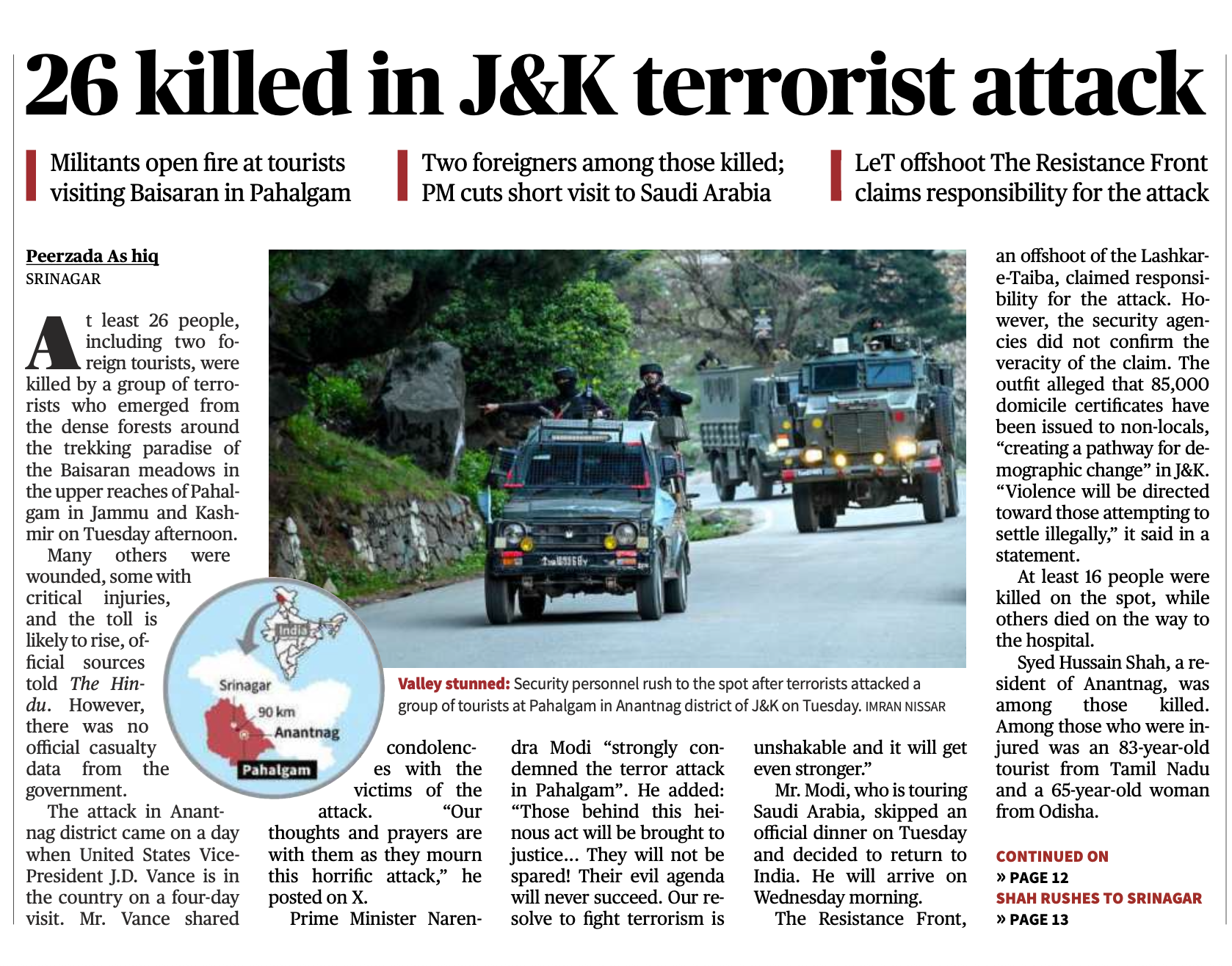द हिन्दू ने लिखा है कि पहलगाम हमले की जिम्मेदारी लेने वाले समूह ‘द रेजिस्टेंट ग्रुप’ (TRF) ने अपने बयान में दावा किया कि ”जम्मू-कश्मीर में 85 हज़ार ग़ैर स्थानीय लोगों को मूल निवास प्रमाणपत्र जारी किए गए जो कि वहां की डेमोग्राफी बदलने के तहत हुआ। हम ऐसे लोगों के ख़िलाफ़ हिंसा करेंगे जो वहां अवैध रुप से बसने की कोशिश करेंगे।” अख़बार ने बताया है कि टीआरएफ एक आतंकी समूह है जो कि पाकिस्तान से संचालित हो रहे लश्कर-ए-तैएबा आतंकी संगठन का ही हिस्सा है।
