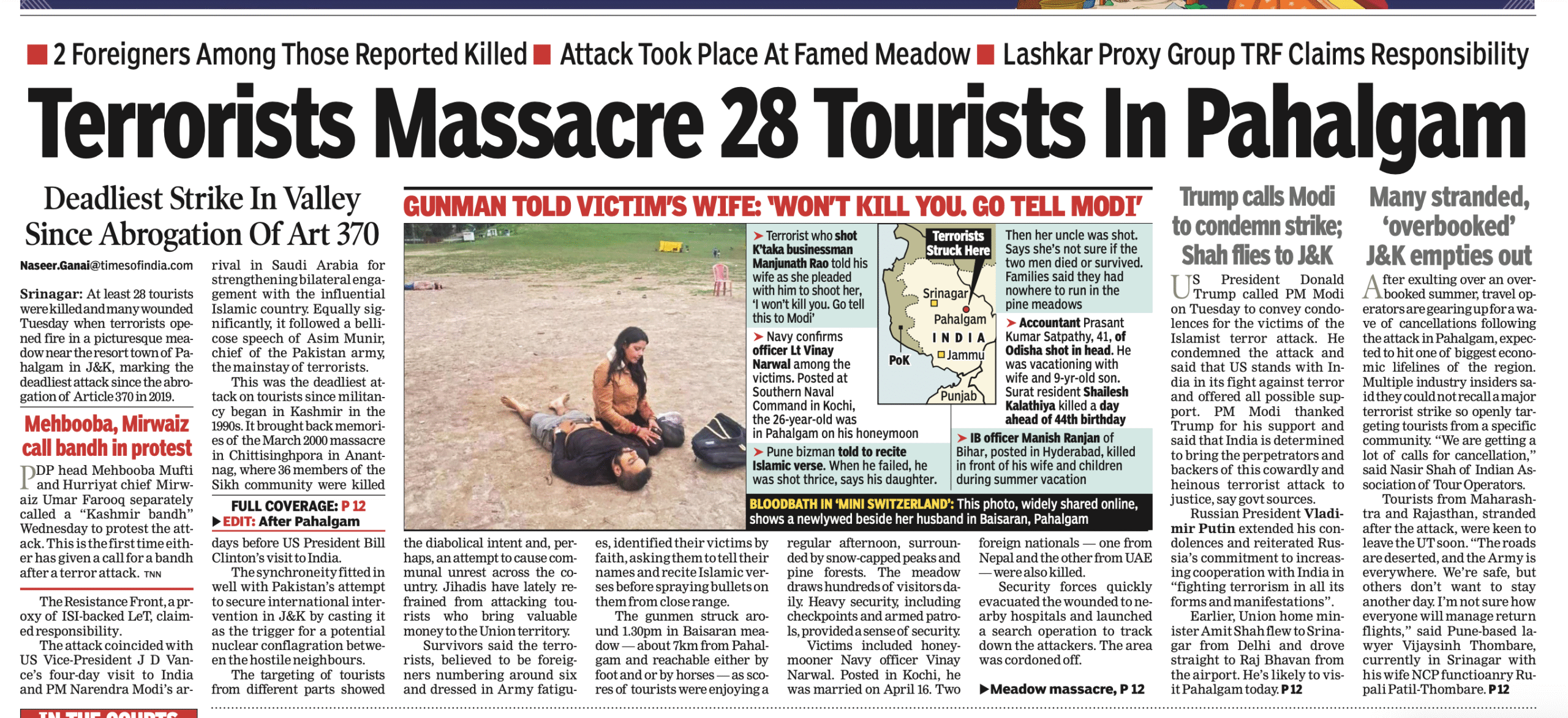 टाइम्स ऑफ इंडिया ने पहले पन्ने की ख़बर में लिखा है कि आतंकवादियों का यह कृत्य जिसमें उन्होंने धार्मिक मान्यता के आधार पर लोगों को चुनकर मारा, यह संभवता देश में धार्मिक दंगे कराने की नीयत से किया गया था। अख़बार लिखता है कि इससे पहले तक पर्यटकों पर आतंकवादी गोलीबारी करने से बचते थे क्योंकि उनके ज़रिए ही इस केंद्रशासित प्रदेश में रूपया पहुंचता है।