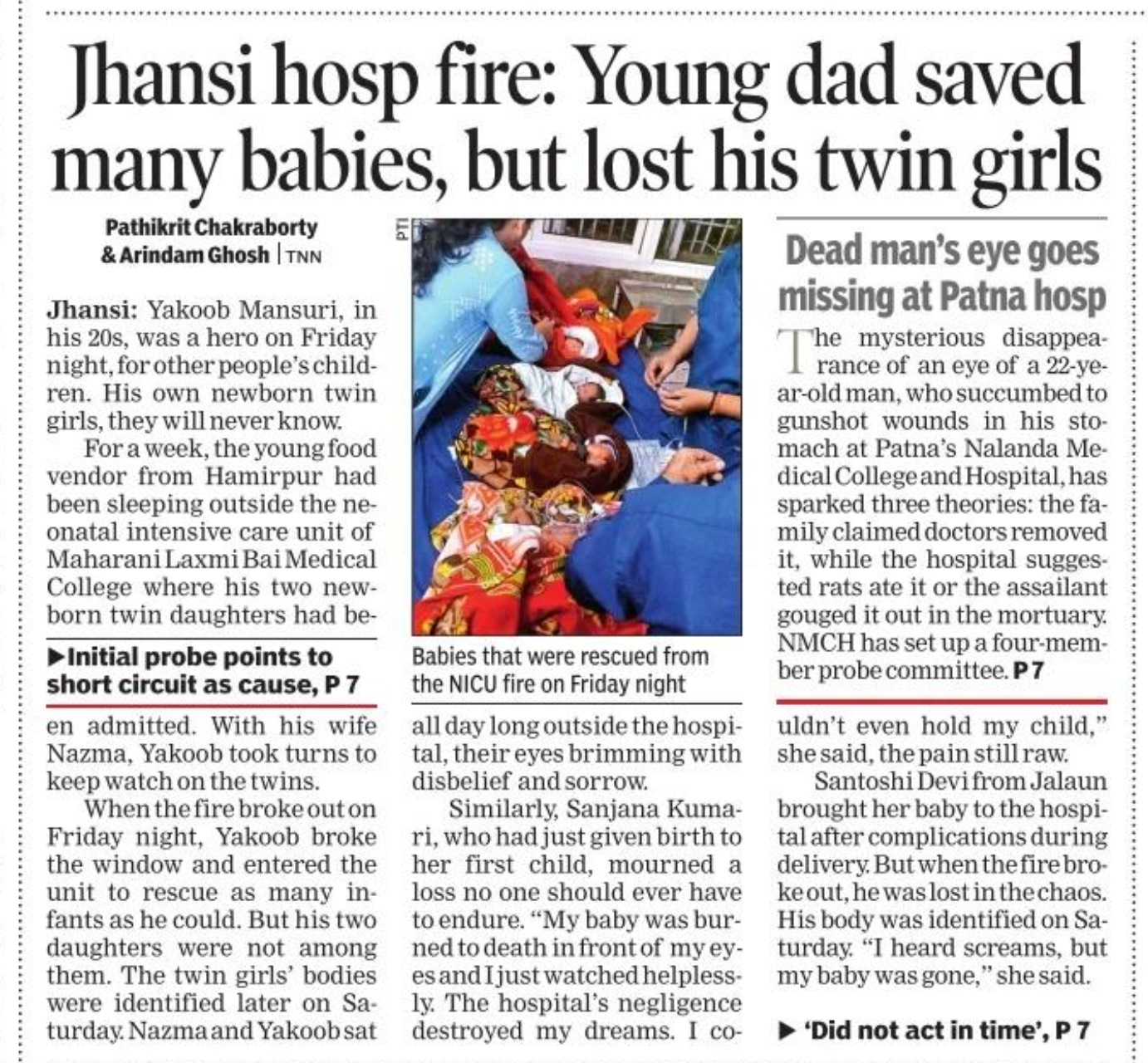 20 साल के पिता याकूब मंसूरी की कहानी टाइम्स ऑफ इंडिया ने पहले पन्ने पर लगाई है जो कई बच्चों के जीवनरक्षक साबित हुए। हालांकि अखबार लिखता है कि उनकी अपनी जुड़वा बेटियां ये बात कभी नहीं जान पाएंगी क्योंकि उनके पिता ने एनआईसीयू का शीशा तोड़कर कई नवजातों को बचाया और वे उनके लिए हीरो बन गए हैं। बदकिस्मती से ये दोनों बच्चियां उसी वॉर्ड में जल गईं। अखबार लिखता है कि याकूब एक ढेला चलाते हैं और अपनी पत्नी से साथ अस्पताल में निढाल पड़े यकीन नहीं कर पा रहे हैं कि उन्होंने अपनी दोनों बच्चियों को खो दिया। बहादुरी की यह कहानी आज के माहौल मेें कही जाना इसलिए भी जरूरी हो जाती है क्योंकि देखा गया है कि बीते कुछ समय से हर बड़ी घटना में कसूरवार ठहराने के लिए मुस्लिम एंगल ढूंढा जा रहा है।