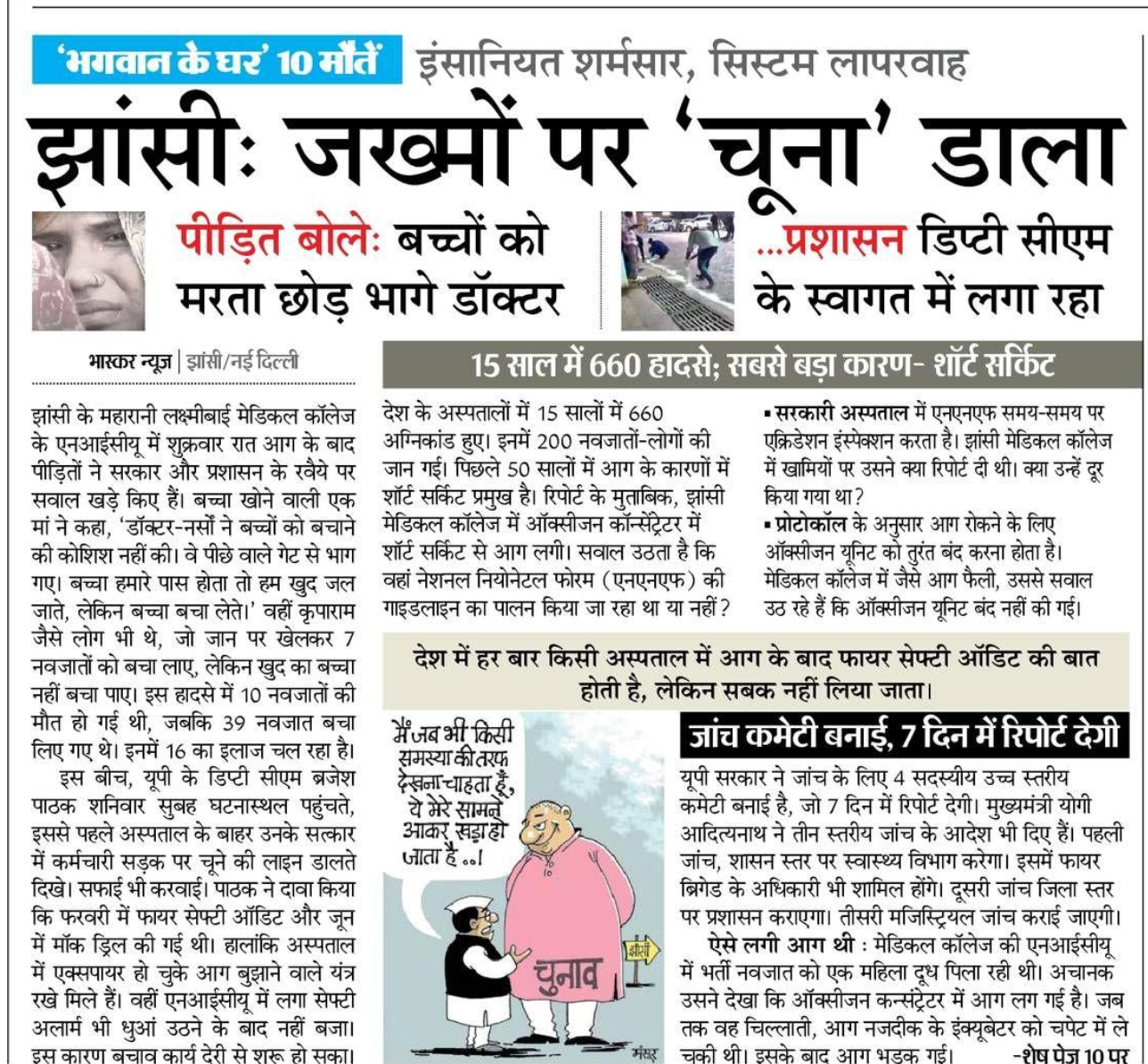 झांसी के महारानी लक्ष्मीबाई मेडिकल कॉलेज में शुक्रवार की रात पौने 11 बजे दस नवजातों की जलकर मौत होने की खबर को आज सभी अखबारों ने प्रमुखता से लगाया है। दैनिक भास्कर ने पीड़ितों के हवाले से लिखा है कि नवजातों को बचाने के बजाय अस्पताल कर्मी जान बचाकर भाग गए। इंडियन एक्सप्रेस ने लिखा है कि 18 सीटों वाले एनआईसीयू में 54 बच्चों का इलाज चल रहा था जो कि क्षमता से बहुत अधिक हुआ। इतनी गंभीर घटना की कवरेज पर विस्तार से बात करने से पहले जान लीजिए कि दैनिक जागरण ने पहले पन्ने पर यह खबर ही नहीं लगाई है।