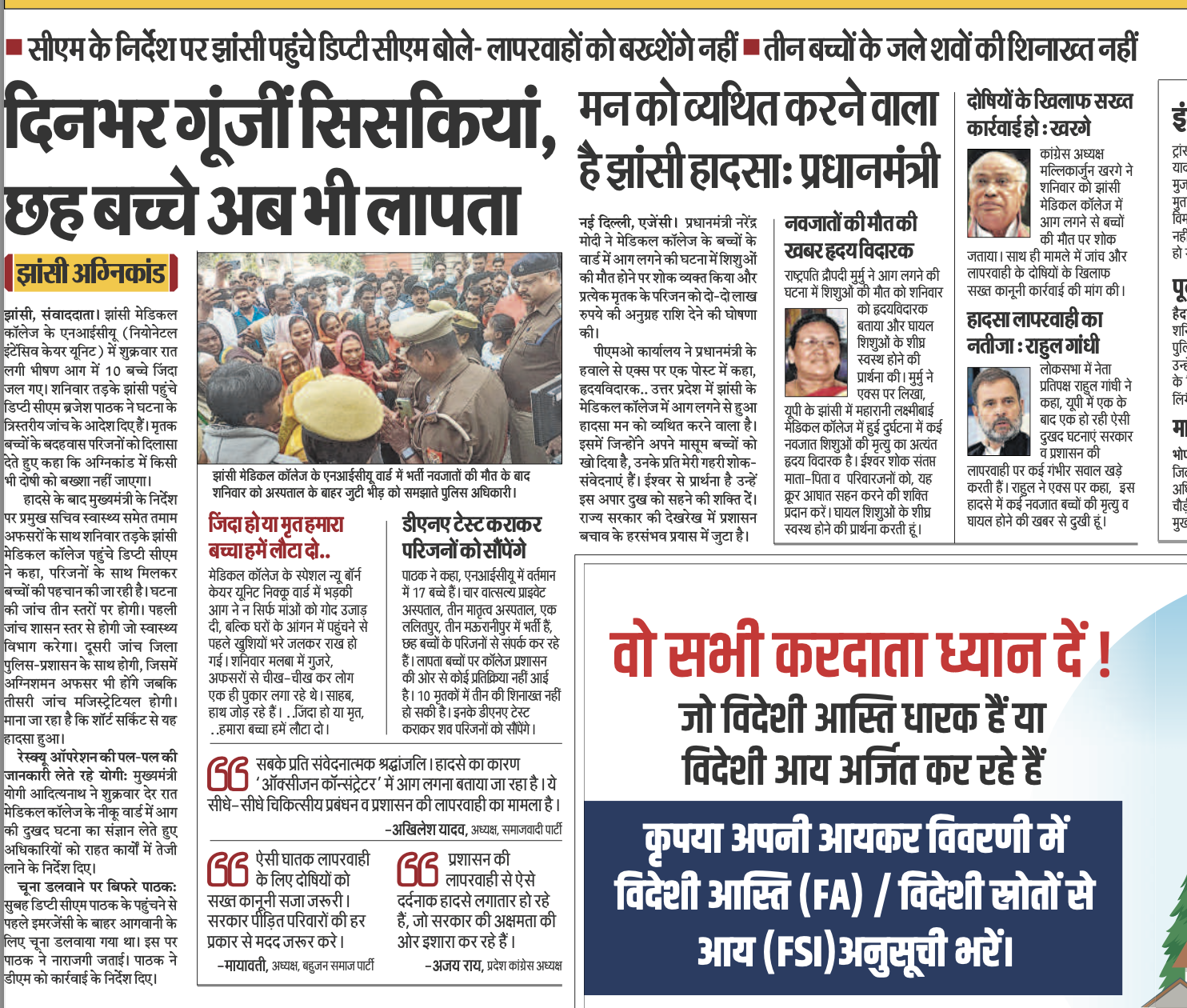 दैनिक जागरण ने पहले पन्ने पर खबर ही नहीं लगाई। दूसरे पन्ने पर की गई कवरेज की हेडिंग है – ‘झांसी मेडिकल कॉलेज में ऑक्सीजन कन्सन्ट्रेटर में हुई स्पार्किंग से लगी थी आग’। इसी एंगल पर अखिलेश यादव ने भी सरकार को घेरा है। कुछ अखबारों ने अखिलेश तो कुछ ने राहुल गांधी का बयान कवरेज में शामिल किया है। सभी ने बताया है कि इस मामले में राज्य सरकार पांच-पांच लाख व केंद्र सरकार दो-दो लाख रुपये मृत नवजातों के परिजनों को देगी जबकि घायल नवजातों के परिजनों को 50-50 हजार रुपये की मदद दी जाएगी।