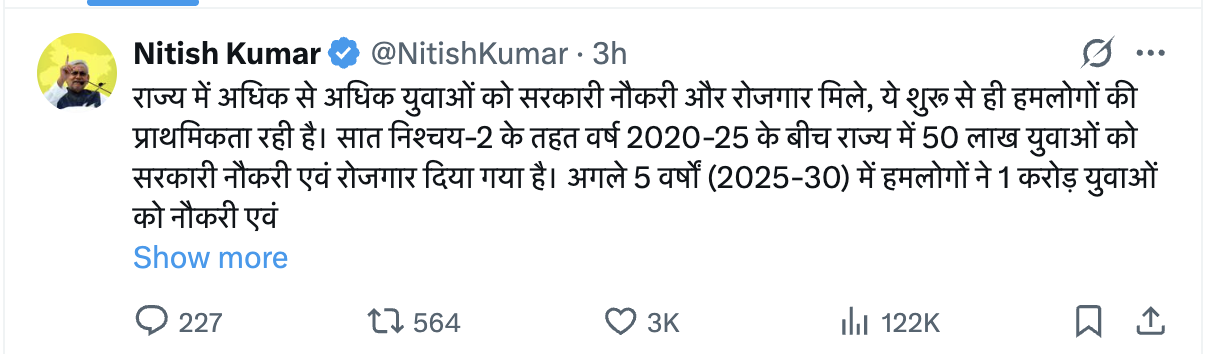 - अगले 5 सालों में 1 करोड़ युवाओं को रोजगार देने का लक्ष्य, नीतीश कैबिनेट की पहली बैठक में लगी मुहर।