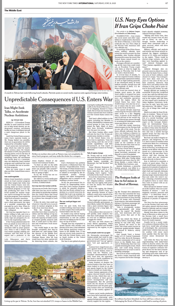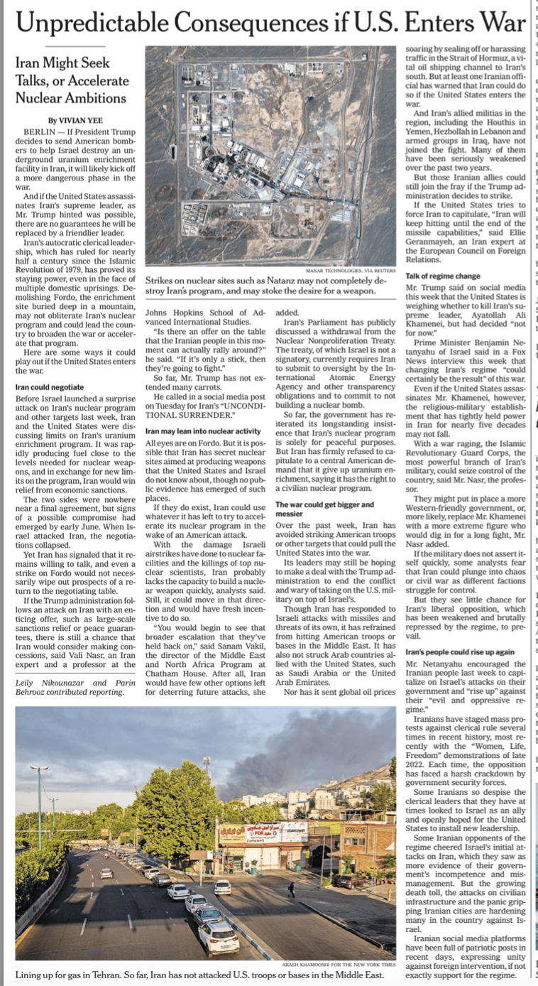 न्यूयॉर्क टाइम्स ने 21 जून 2025 को एक लेख प्रकाशित किया जिसका शीर्षक – “Unpredictable Consequences if U.S. Enters War” है। इसमें लिखा कि ईरान के परमाणु संवर्धन केंद्र फोर्डो पर अगर अमेरिका हमला करता है या फिर ईरान के सर्वोच्च नेता अयातुल्ला अली खामेनेई की हत्या की जाती है तो ये कदम इस युद्ध को खतरनाक मोड़ दे सकती है। लेख में कहा गया कि फोर्डो पर हमला ईरान के परमाणु कार्यक्रम को पूरी तरह खत्म नहीं कर सकता, बल्कि ईरान को परमाणु हथियार विकास में तेजी लाने या युद्ध का विस्तार करने के लिए उकसा सकता है। साथ ही लिखा है कि यह अस्पष्ट है कि ऐसा करने से ईरान का परमाणु कार्यक्रम रुकेगा।