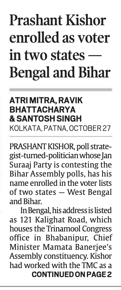 आपको बता दें कि 28 अक्तूबर के एडिशन में द इंडियन एक्सप्रेस ने इस बाबत खबर छापी, जिसमें अखबार ने लिखा कि प्रशांत किशोर ने 2021 में प. बंगाल की वोटर लिस्ट में अपना नाम जुड़वाया था। तब वे तृण मूल कांग्रेस (TMC) पार्टी के लिए चुनावी रणनीतिकार के तौर पर काम कर रहे थे,