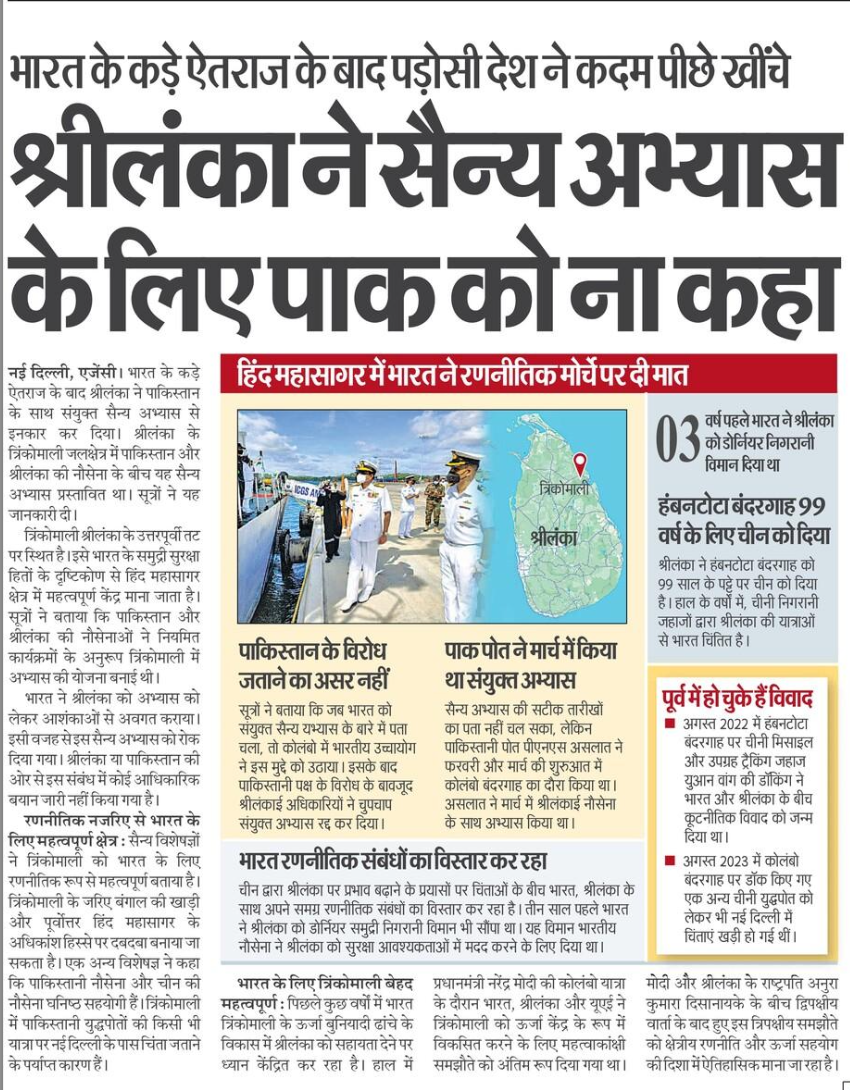 इस हेडलाइन के साथ दैनिक हिन्दुस्तान अख़बार ने यह ख़बर पहले पन्ने पर लीड लगाई है। जिसमें बताया गया है कि भारत के पड़ोसी देश श्रीलंका में पाकिस्तान की नौसेना के साथ एक संयुक्त सैन्य अभ्यास किया जाना था, जिसकी जानकारी होने पर भारत ने इसका विरोध जताया और इसके बाद श्रीलंका ने कदम पीछे खींच लिए हैं। अख़बार ने ख़बर में लिखा है कि इस मामले पर पाक व श्रीलंका दोनों ही ओर से कोई आधिकारिक बयान जारी नहीं हुआ है पर अभ्यास से श्रीलंका ने हाथ पीछे खींच लिए हैं, ऐसा सूत्रों ने बताया है। दैनिक हिन्दुस्तान ने यह ख़बर न्यूज़ एजेंसी के हवाले से लगाई है। ग़ौरतलब है कि इस मामले की ख़बर किसी अन्य प्रमुख अख़बार में नहीं छपी है।  अख़बार का कहना है कि यह अभ्यास त्रिंकोमाली में होना था, यह क्षेत्र भारत के लिए राजनीतिक रूप से महत्वपूर्ण है क्योंकि त्रिंकोमाली के जरिए बंगाल की खाड़ी और पूर्वोत्तर हिंद महासागर के अधिकांश हिस्से पर दबदबा बनाया जा सकता है।  हाल में प्रधानमंत्री मोदी की कोलंबो यात्रा के दौरान भारत, श्रीलंका और यूएई ने त्रिंकोमाली को ऊर्जा केंद्र के रूप में विकसित करने के लिए महत्वाकांक्षी समझौते को अंतिम रूप दिया गया था।
