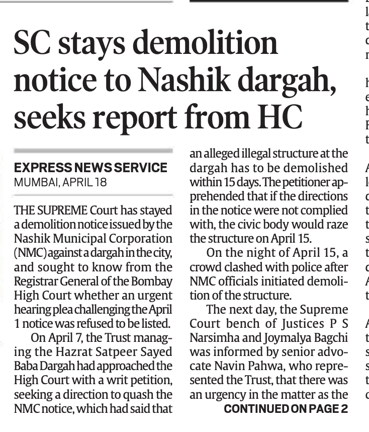 इंडियन एक्सप्रेस ने पहले पन्ने पर एक और महत्वपूर्ण ख़बर लगाई कि नासिक के एक प्राचीन दरगाह के आसपास अवैध अतिक्रमण हटाने के लिए नासिक नगर निगम के दिए गए ध्वस्तिकरण नोटिस पर सुप्रीम कोर्ट ने रोक लगा दी है। साथ ही सर्वोच्च अदालत ने बॉम्बे हाईकोर्ट से पूछा है कि हजरत सतपीर सैयद बाबा दरगाह की ओर से इस ध्वस्तिकरण के नोटिस को चुनौती देने वाली याचिका को सूचीबद्ध करने और सुनवाई करने से क्या इनकार कर दिया गया था? बता दें, 15 अप्रैल की रात में एनएमसी अधिकारियों ने जब निर्माण गिराने की कार्रवाई शुरू की तो भीड़ की पुलिस के साथ झड़प हो गई थी।