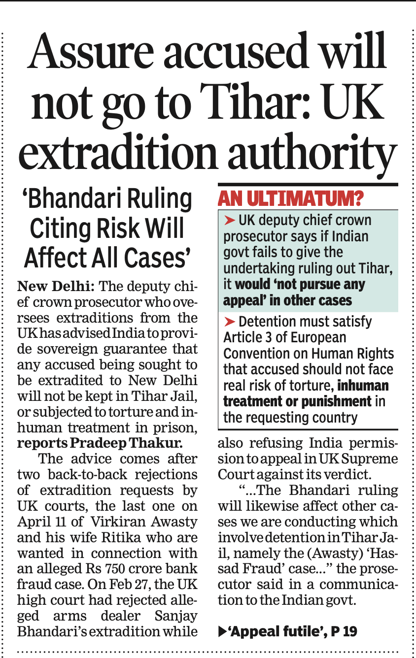 भारत की अदालतों विशेषकर तिहाड़ में बंद आरोपियों के साथ कथितरूप से होने वाले टॉर्चर का मुद्दा उठाते हुए ब्रिटेन की प्रत्यर्पण अथॉरिटी ने भारत के सामने शर्त रखी है कि अगर वह यह सुनिश्चित करेगा कि जो बड़े अपराध के आरोपी वह भारत में बुलाना चाहता है, उन्हें तिहाड़ में नहीं रखेगा.. तब ही वे (ब्रिटेन) भारत में प्रत्यर्पण की अपील पर सुनवाई करेंगे। द टाइम्स ऑफ इंडिया ने यह अहम ख़बर पहले पन्ने पर लगाई है।