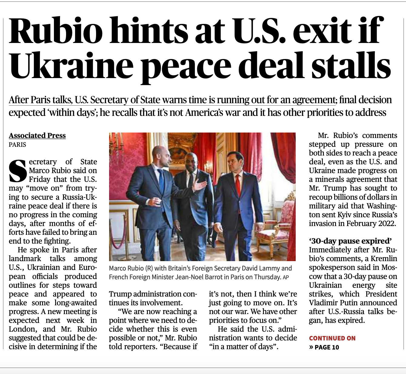 द हिन्दू ने पहली ख़बर लगाई है कि अमेरिकी विदेश मंत्री ने कहा है कि यूक्रेन में युद्ध रोकने के प्रयासों में अगर कुछ और देशों देशों ने  अच्छा प्रदर्शन नहीं हुआ तो अमेरिका इस प्रयास से खुद को अलग कर लेगा। अमेरिका के विदेश मंत्री मार्को रूबियो ने कहा कि हम इस कोशिश में महीनों तक नहीं जुटे रहेंगे, ृहमारे पास और भी कई काम हैं।