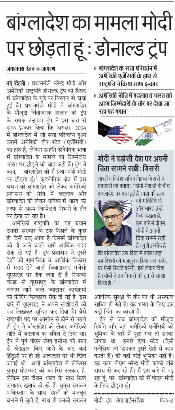 दैनिक जागरण की पहले पन्ने पर उपरोक्त शीर्षक से लगी खबर भी काफी महत्वपूर्ण है, जिसमें ट्रंप के पूरे बयान को अखबार ने सबसे नीचे लिखा है। ये बयान ट्रंप का भारत पर एक तरह से आरोप के तौर पर भी देखा जा सकता है। अखबार ने लिखा कि ट्रंप से जब बांग्लादेश की मौजूदा स्थिति और वहां अमेरिकी एजेंसियों की भूमिका के बारे में पूछा गया तो उनका जवाब था, ‘हमारे डीप स्टेट (ऐसी एजेंसियां जो छिपकर दूसरे देशों में काम करती हैं)’ की वहां कोई भूमिका नहीं है। यह काम पीएम नरेंद्र मोदी काफी लंबे समय से कर रहे हैं। मैं इस बारे में पढ़ रहा हूं, पर बांग्लादेश को मैं पीएम मोदी के लिए छोड़ता हूं।‘ ट्रंप के इस बयान के कई मायने निकाले जा सकते हैं। गौरतलब है कि बांग्लादेश में शेख हसीना की सरकार का तख्ता पलट हो जाने के बाद व उन्हें भारत में शरण दिए जाने के चलते बांग्लादेश में यह भावना जोर ले रही है कि भारत उनकी घरेलू राजनीति में दखल देता है। ऐसे में ट्रंप के इस बयान को किस तरह सकारात्मक कहा जा सकता है, यह तो अखबार ही जाने, पर अखबार ने मोदी की यात्रा के प्रमुख हासिल के तौर पर इसे रेखांकित किया है। इंडियन एक्सप्रेस ने भी इस खबर को ट्रंप के बयान के आधार पर लगाया है, हालांकि खबर को अंदर के पेज पर जगह दी है।