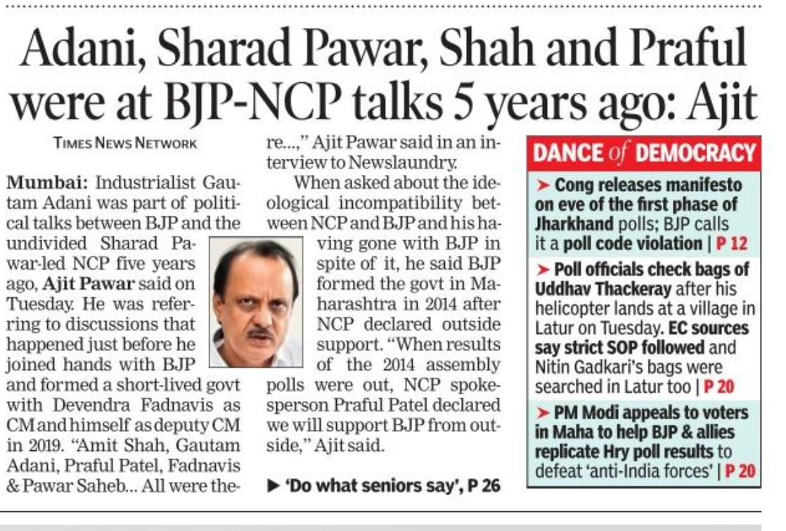 ‘पांच साल पहले महाराष्ट्र में भाजपा की सरकार बनाने को लेकर जो बैठक हुई थी, उसमें बड़े नेताओं के साथ उद्योगपति गौतम अदाणी भी मौजूद थे।’ … 13 नवंबर के राष्ट्रीय अखबारों के लिए यह सबसे बड़ी खबर है क्योंकि ये दावा महाराष्ट्र चुनाव से ठीक पहले किया गया। हालांकि पत्रकारिता की स्थिति ऐसी है कि अधिकांश बड़े अखबारों ने इसे छापा ही नहीं। इंडियन एक्सप्रेस ने पहले पन्ने पर विस्तार से इस पर लिखा है। अखबार के मुताबिक, डिजिटल वेबसाइट ‘द न्यूज मिनट’ को दिए एक साक्षात्कार में अजीत पवार ने ऐसा दावा किया।