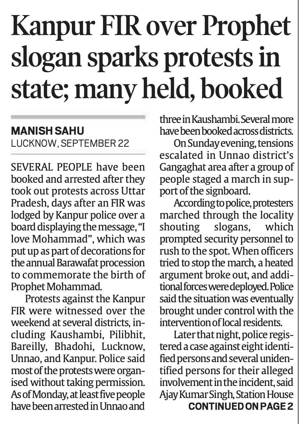 दैनिक हिन्दुस्तान ने 23 सितंबर के संस्करण में खबर की है कि यूपी के उन्नाव व उत्तराखंड के काशीपुर में ‘आई लव मोहम्मद’ के समर्थन में जुलूस निकालने के बाद बवाल हो गया। काशीपुर पुलिस ने रविवार रात हुए बवाल में तीन नामजद व 500 अज्ञात लोगों के खिलाफ केस दर्ज किया है। हालांकि पुलिस का कहना है कि ये कार्रवाई उन्होंने बिना अनुमति जुलूस निकालने को लेकर की है न कि बैनर को लेकर। अखबार के मुताबिक, उन्नाव पुलिस ने 38 लोगों पर मुकदमें दर्ज किए हैं और सात को गिरफ्तार कर लिया है। अखबार का कहना है कि मूल विवाद गलत जगह ‘आई लव मोहम्मद’ का बोर्ड लगाने को लेकर हुआ था, अगले दिन कुछ लोगों ने एक धार्मिक पोस्टर फाड़ दिया, जिस पर दस सितंबर को पुलिस ने केस दर्ज किया, पर लोगों ने इसे ‘आई लव मोहम्मद’ पर केस दर्ज होने के तौर पर प्रचारित किया, जिससे यह विरोध बड़े स्तर पर फैल गया।