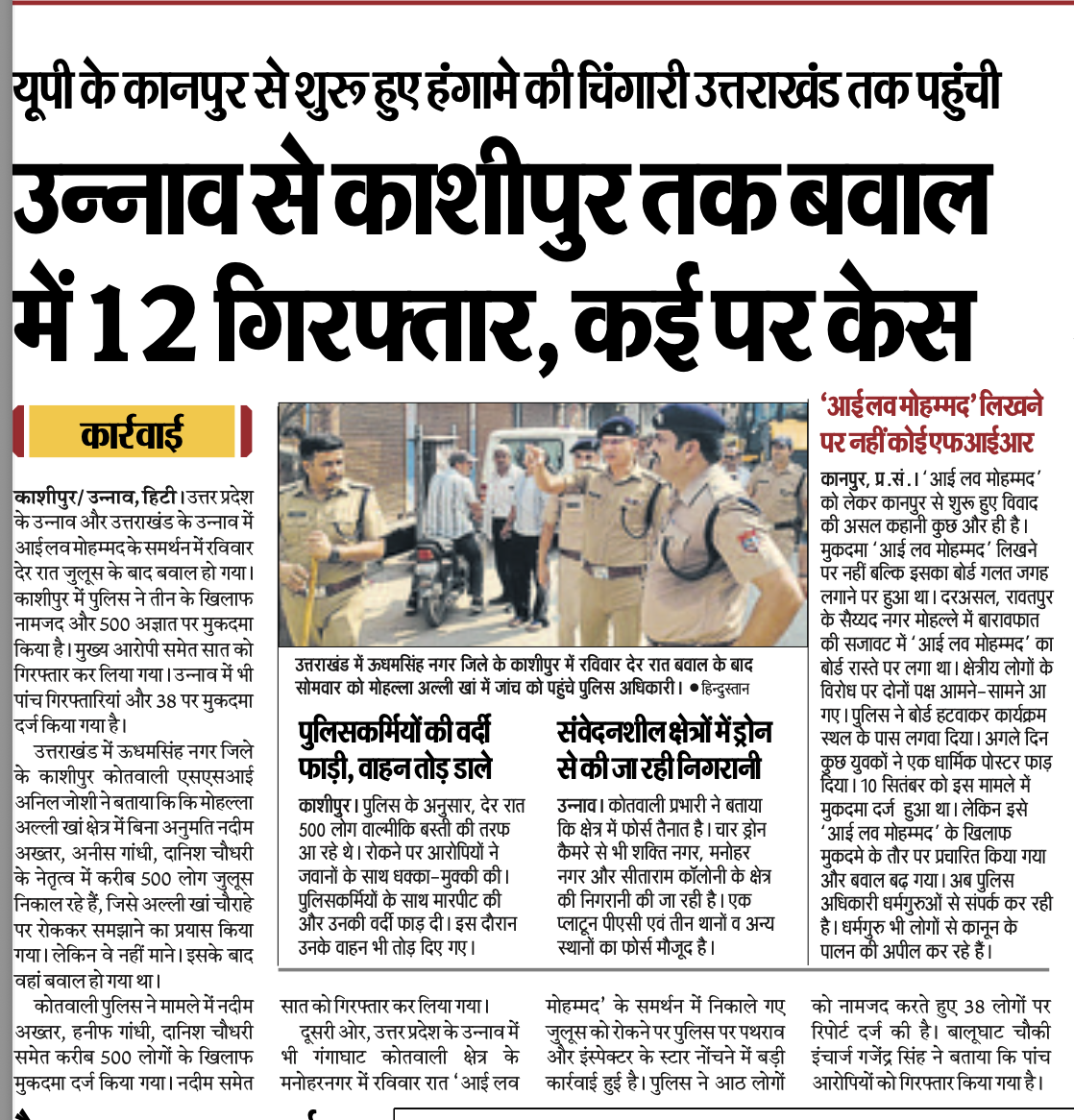 दैनिक हिन्दुस्तान ने 23 सितंबर के संस्करण में खबर की है कि यूपी के उन्नाव व उत्तराखंड के काशीपुर में ‘आई लव मोहम्मद’ के समर्थन में जुलूस निकालने के बाद बवाल हो गया। काशीपुर पुलिस ने रविवार रात हुए बवाल में तीन नामजद व 500 अज्ञात लोगों के खिलाफ केस दर्ज किया है। हालांकि पुलिस का कहना है कि ये कार्रवाई उन्होंने बिना अनुमति जुलूस निकालने को लेकर की है न कि बैनर को लेकर। अखबार के मुताबिक, उन्नाव पुलिस ने 38 लोगों पर मुकदमें दर्ज किए हैं और सात को गिरफ्तार कर लिया है। अखबार का कहना है कि मूल विवाद गलत जगह ‘आई लव मोहम्मद’ का बोर्ड लगाने को लेकर हुआ था, अगले दिन कुछ लोगों ने एक धार्मिक पोस्टर फाड़ दिया, जिस पर दस सितंबर को पुलिस ने केस दर्ज किया, पर लोगों ने इसे ‘आई लव मोहम्मद’ पर केस दर्ज होने के तौर पर प्रचारित किया, जिससे यह विरोध बड़े स्तर पर फैल गया।