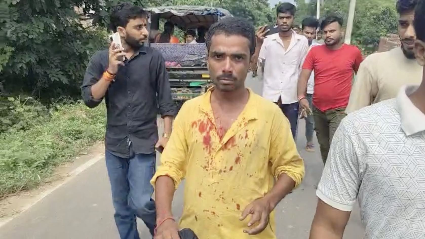 झगड़े के दौरान स्थानीय युवक के कपड़े पर खून के धब्बे गिर गए जो घटना की गंभीरता का संकेत।