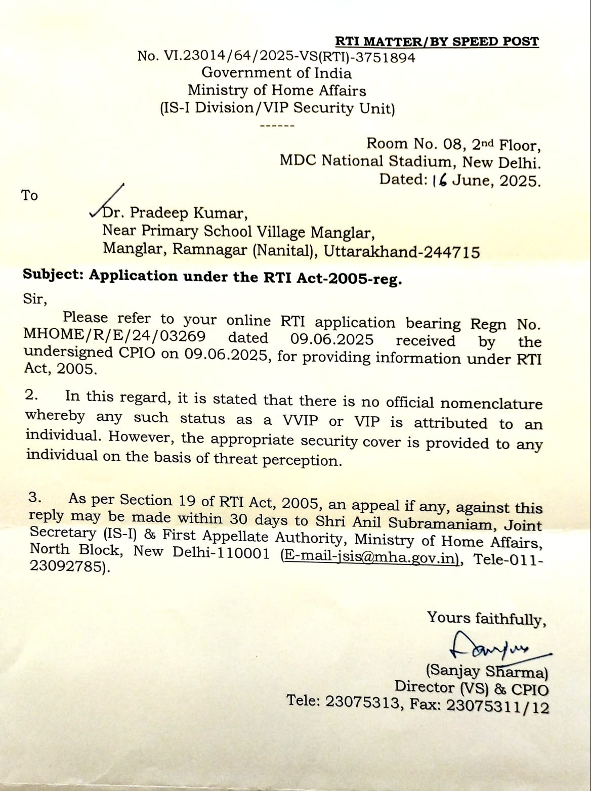 9 जून 2025 को बरेली कॉलेज के पूर्व लॉ विभागाध्यक्ष और आरटीआई कार्यकर्ता डॉ. प्रदीप कुमार ने गृह मंत्रालय से पूछा कि वीआईपी और वीवीआईपी दर्जे के लिए कौन पात्र है, और इससे संबंधित नियम, अधिसूचनाएं, या सरकारी आदेश उपलब्ध कराए जाएं। 16 जून 2025 को गृह मंत्रालय की वीआईपी सिक्योरिटी यूनिट ने जवाब दिया कि “ऐसा कोई आधिकारिक नामकरण (nomenclature) नहीं है जो किसी व्यक्ति को वीआईपी या वीवीआईपी का दर्जा देता हो।” सुरक्षा का निर्धारण खुफिया एजेंसियों द्वारा खतरे के आकलन (threat perception) के आधार पर होता है। डॉ. प्रदीप ने इस जवाब को असंतोषजनक बताया, उनका कहना है कि यूनिट का नाम ही ‘वीआईपी सिक्योरिटी यूनिट’ है, जो स्वयं विरोधाभासी है।