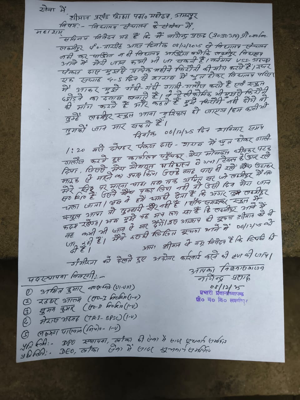 प्रधानाध्यापक का शिकायत पत्र